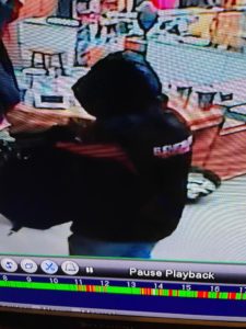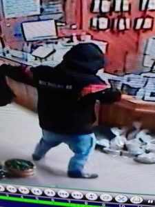 Surveillance video captured images of the suspect. Officials describe him as a white male, 5’7″ to 5’10” tall, weighing approximately 225 pounds. He was wearing a black Cincinnati Bengals jacket, ball cap, black mask, light-colored blue jeans, and black boots and was carrying a black duffel bag.