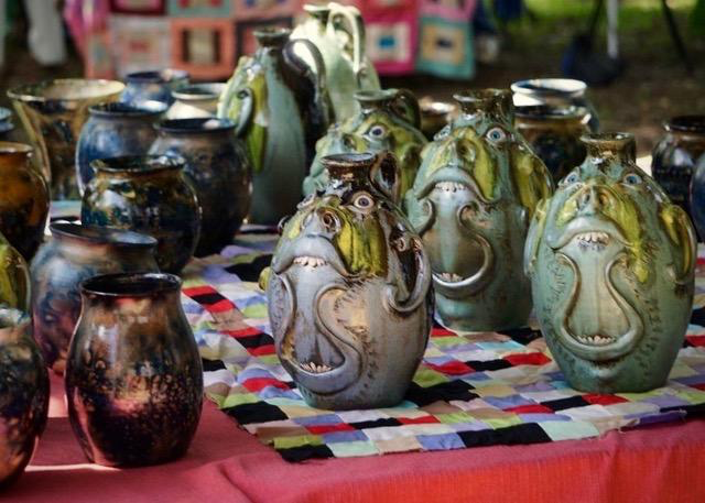 I always enjoy having the opportunity to talk with the artists personally and thoroughly enjoyed conversations with potters and painters at the festival. It as the work of potter Aubrey Lewallen that most called to me personally. Aubrey is a self-taught potter who’s only been working with clay for four years. Yet, he was invited to display his pottery last year next to long-time, seasoned potters. He admits that the opportunity was a little daunting. Aubrey has chosen not to work as a potter’s apprentice, as is customary, so he can truly listen to his own creative voice. Aubrey describes his process as completely trial and error, and sometimes his creations even surprise him. Aubrey resides in Lula and works full time when he’s not creating.