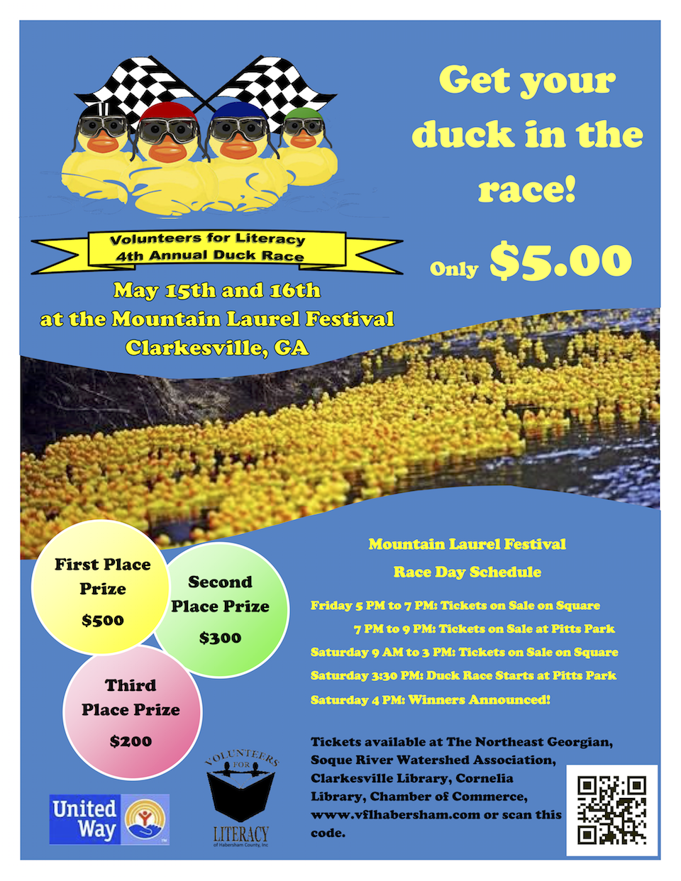 Duck adoption tickets are only $5. Every ticket you buy increases your chances of winning a share of $1,000 in cash prizes. PLUS, every ticket you buy will be matched, dollar for dollar, through a generous matching grant from a donor with the Communities of Coastal Georgia Foundation. That means your tax deductible donation is doubled, with all proceeds going to support Volunteers for Literacy of Habersham County (VFL).