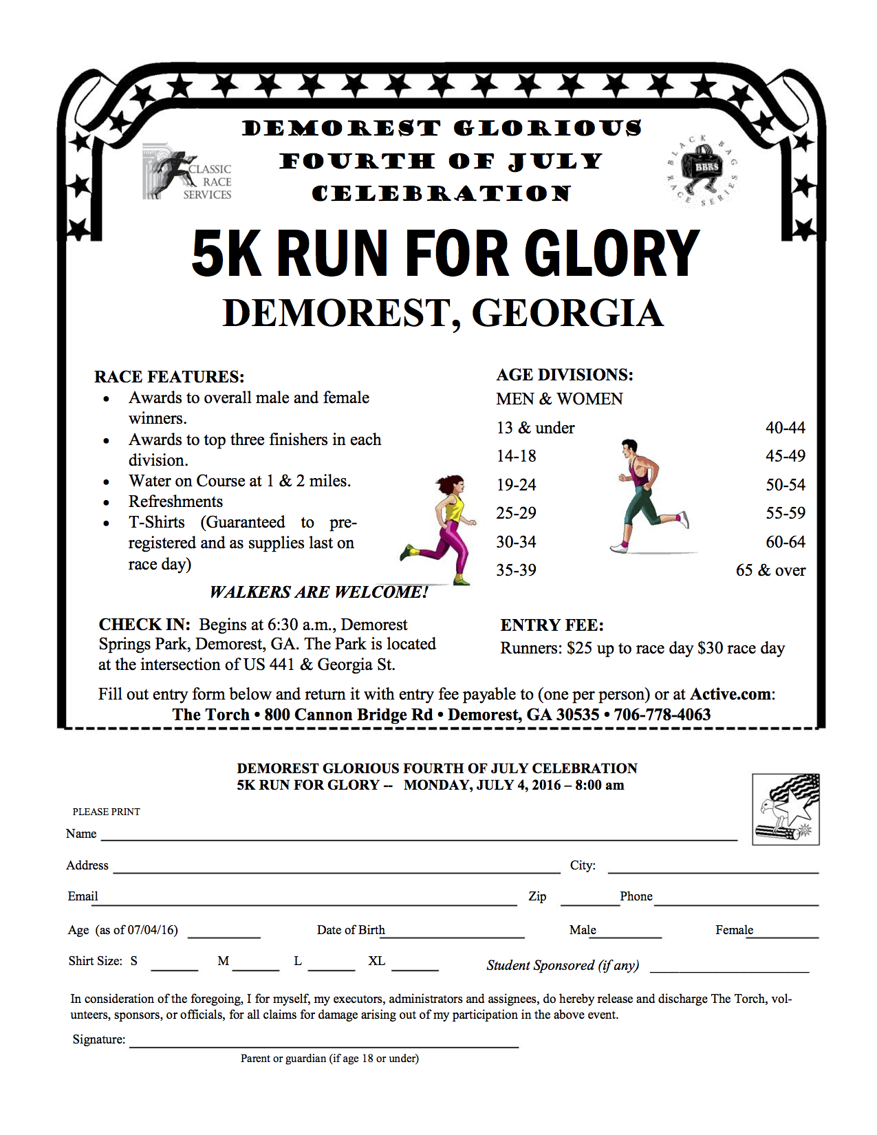 The Torch of Demorest is sponsoring a 5K run on July 4th to raise money for its ONEWAY student ministry.The road race is for people of all ages. Awards will be given in various categories. Registration fees include t-shirts and refreshments. Registration is $25 up to race. $30 on race day.