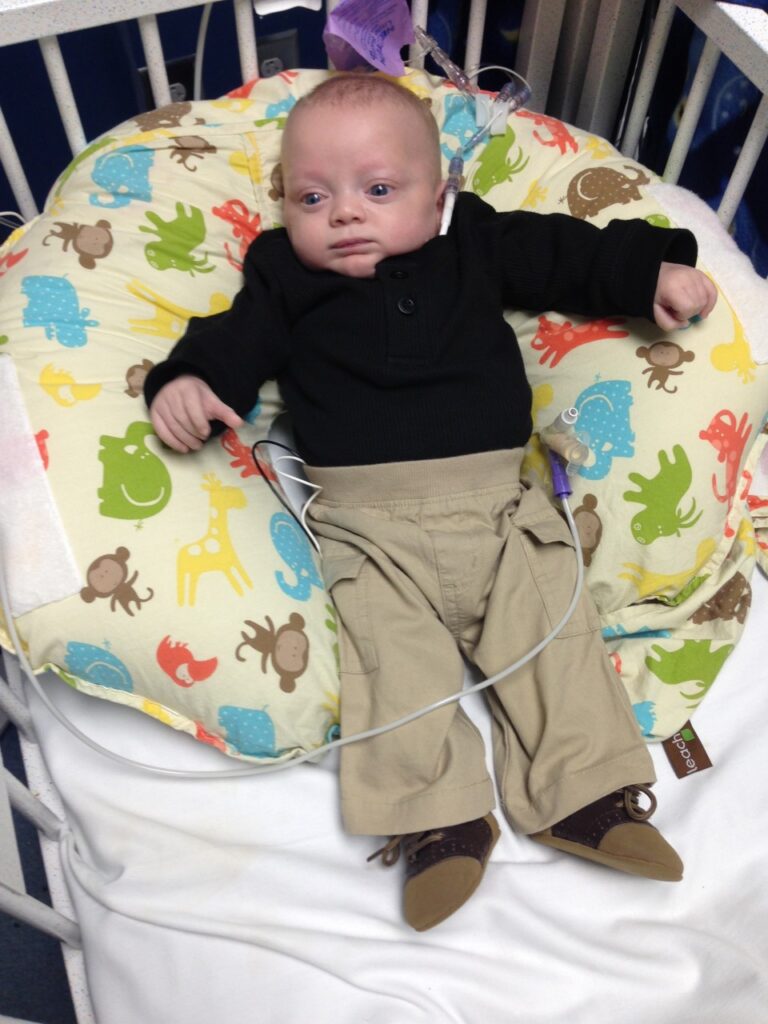In October, concern was raised that Colton might have a blockage. A contrast study was attempted, but could not be completed. Doctors began to discuss the possibility of sending the family to Children’s Hospital in Philadelphia for an intestinal transplant. The decision was made to go into surgery, resolve the blockage and try to remove the colostomy bag by trying to reattach the tiny bit of intestines remaining. He only had 6cm after the emergency surgery. Once in the operating room, the surgeon was shocked. Colton no longer had 6cm of intestine. He had almost 60cm and had regrown his bowel completely. The surgery was sucessful and no transplant was needed.