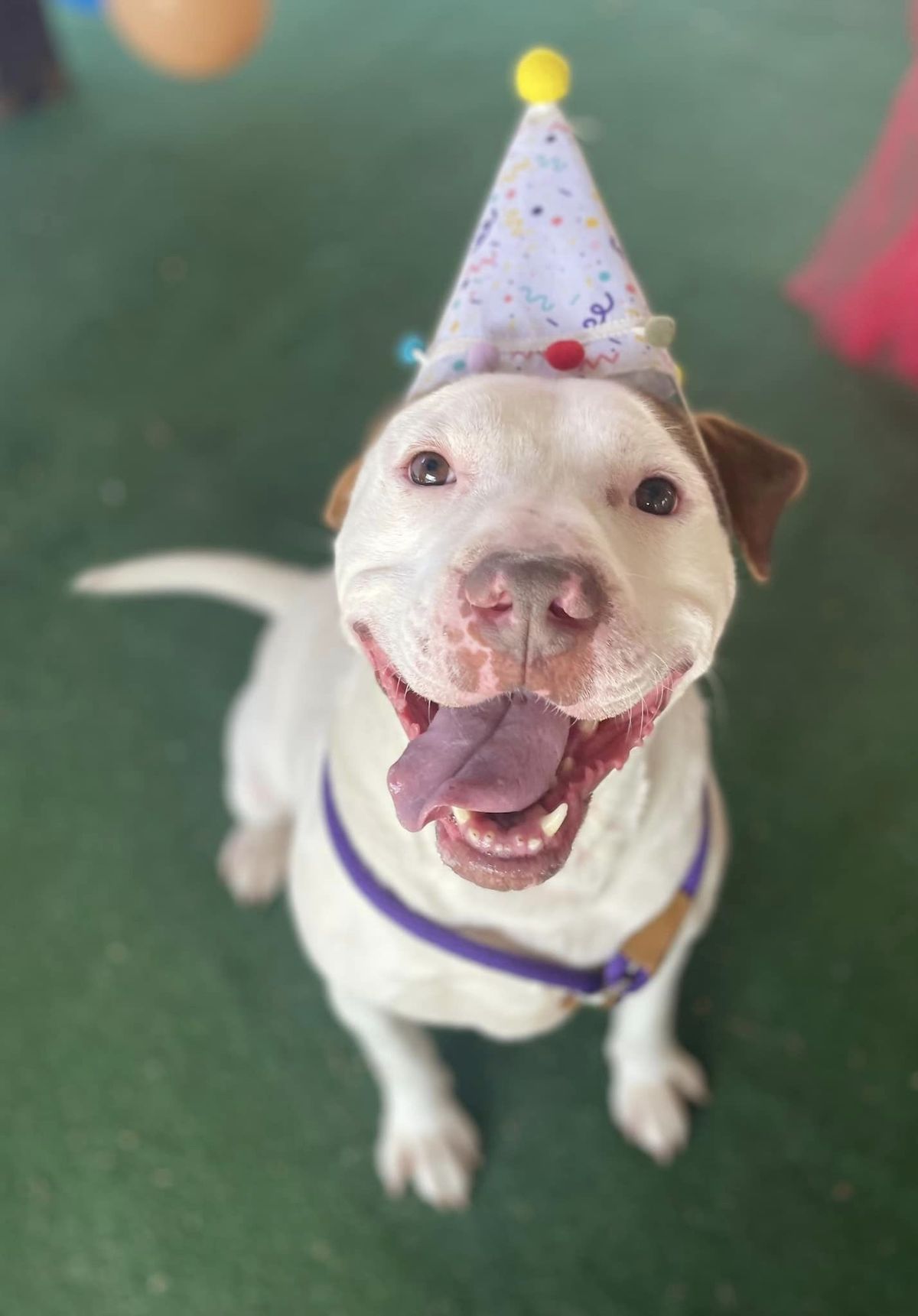 Mutley partied in the play yard eating dog-friendly cake, chasing balloons, and taking glamour shots with his shelter family.
