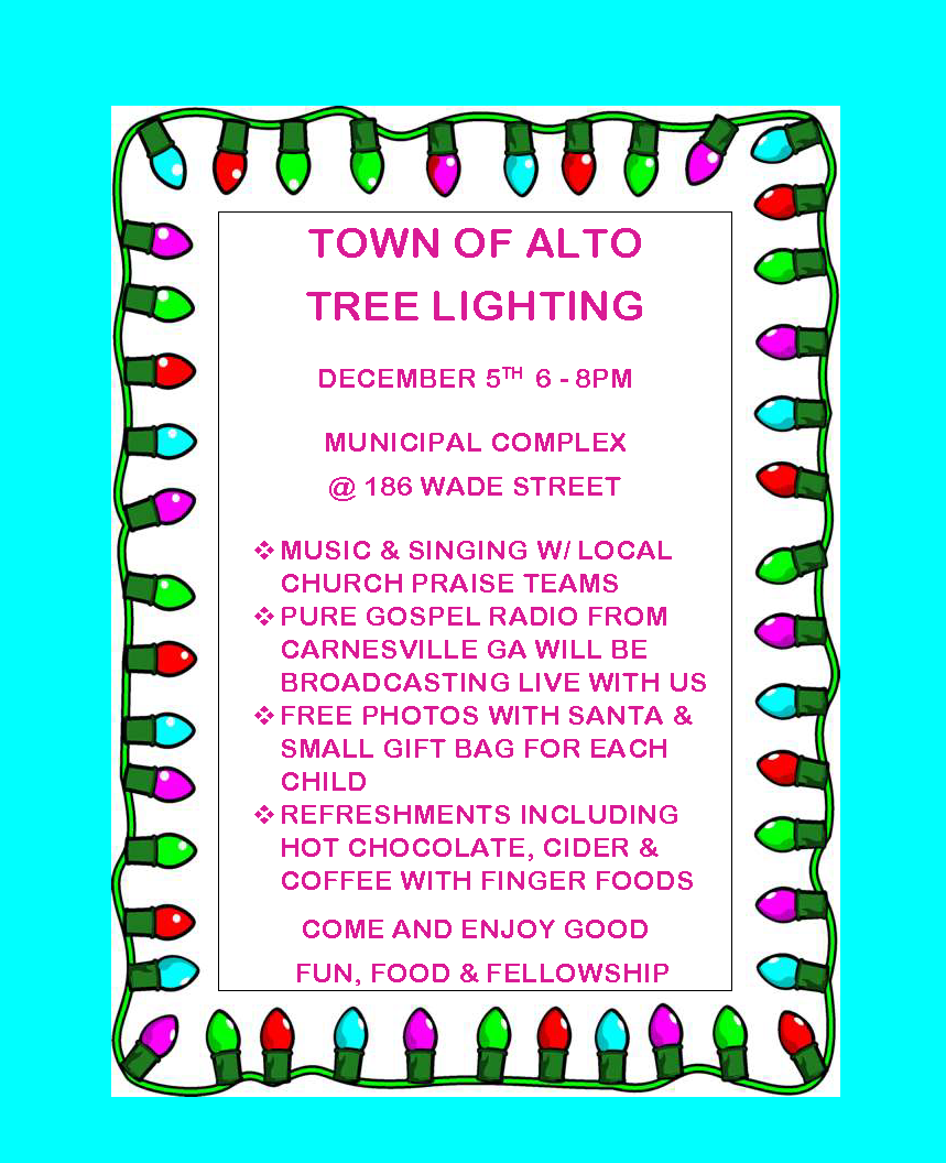 The Town of Alto will hold its annual Christmas Tree Lighting from 6-8 p.m. on Thursday, December 5. The event will be held at the Alto Municipal Complex at 186 Wade Street.