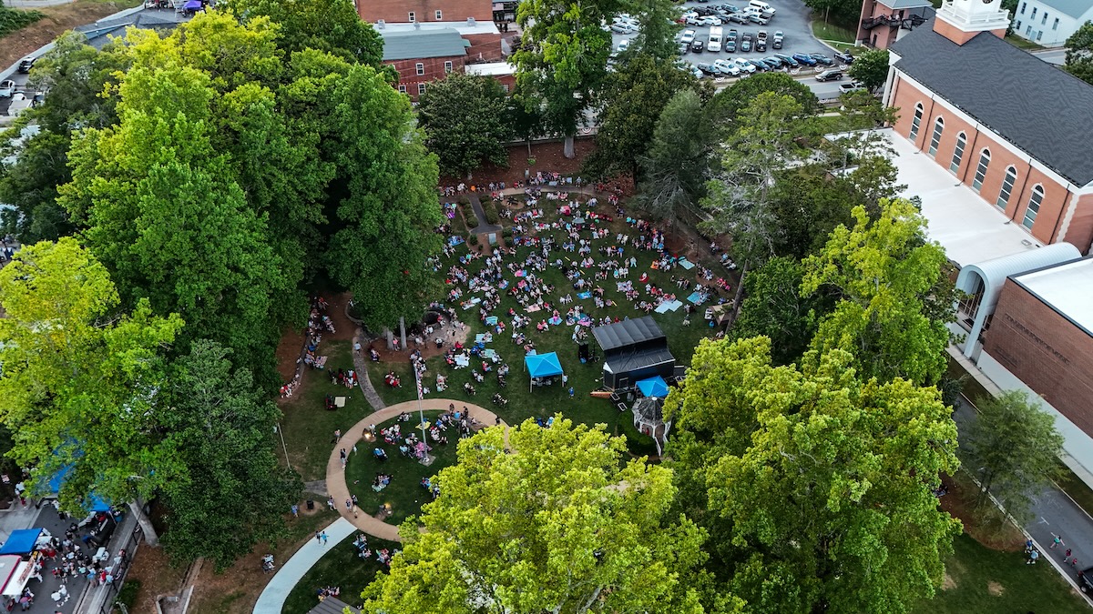 FILE PHOTO – An aerial view of Demorest Springs Park as crowds spread out to enjoy an evening of music during the Glorious Fourth celebration on Thursday, July 4, 2024. (Daniel Purcell/NowHabersham.com)