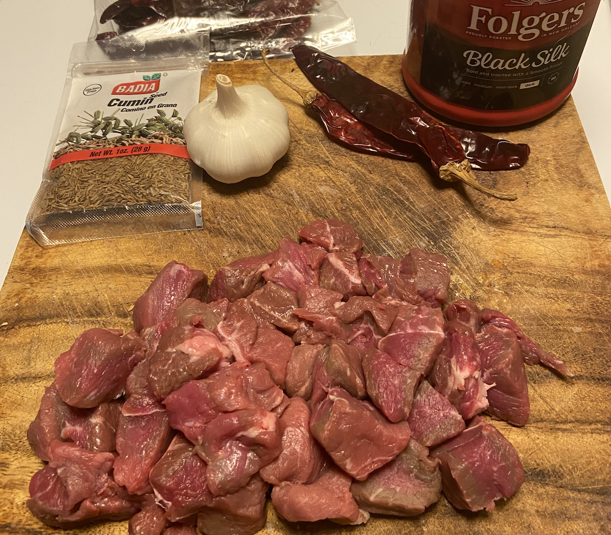 Chiles: Using a paste you make fresh from dried chiles will result in a fresher, more flavorful chili than using chili powder. Use the type of chiles you include in order to determine the heat of your chili; trying to increase the heat by increasing the number of chiles will cause the chile flavor to overpower the flavor of the meat. The addition of fresh jalapeno and/or serrano peppers will also allow for customization of the spiciness. You can use six of the same chiles, or combine different types of chiles to influence the heat and the flavor. Here are some of the more commonly-available dried chiles – most available at local grocery stores. If you choose to use chili powder, eliminate chiles, cumin and oregano and add ½ cup chili powder (more or less, to taste) at the same time you add the cumin.