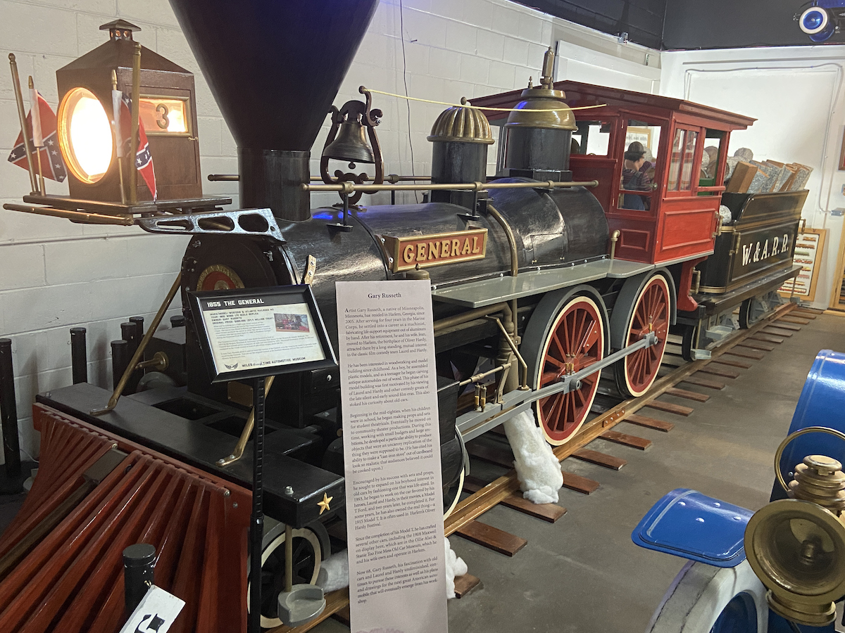 I would say that Miles Through Time Automotive Museum is hidden away at the back of the Old Clarkesville Mill, but it’s hard to be stealthy with a Volkswagen Bug with neon flashing headlights perched on a pole some 15 feet above the entrance.