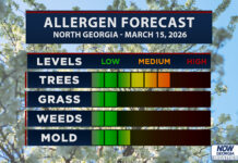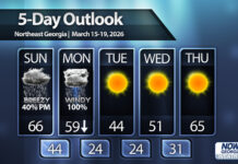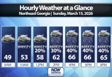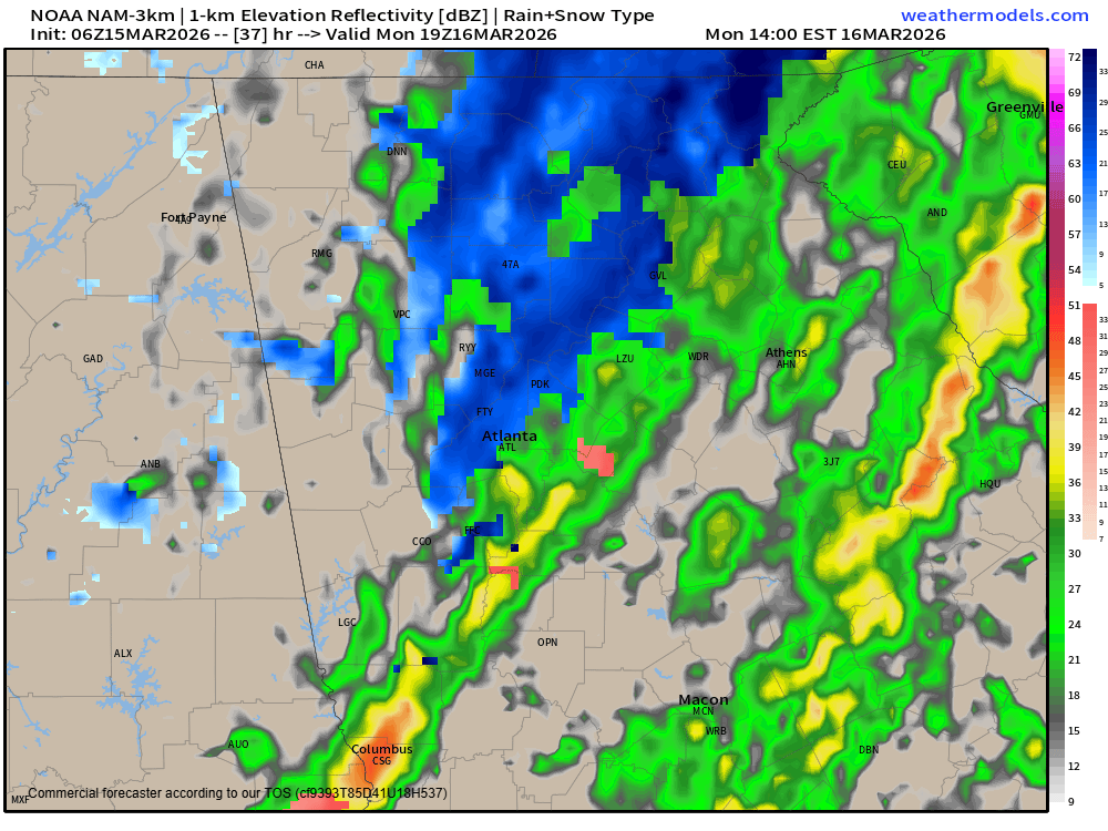 Damaging winds are the primary threat with this line and they could be fairly widespread. This set-up will also be ripe for quick spin-up tornadoes along the line. Any storms that develop ahead of the line will have a higher risk for brief tornadoes as well. The severe threat should push into far southeast Georgia by 9-10 a.m. An additional risk for severe storms will develop along a second line of storms on Monday afternoon. The bulk of this threat will be limited to southeast Georgia with a much higher risk from the Carolinas into the mid-Atlantic. Surface temperatures will have plummeted to the 30s/40s in the northern 2/3 of the state by early afternoon so any severe threat will have to occur east of that.