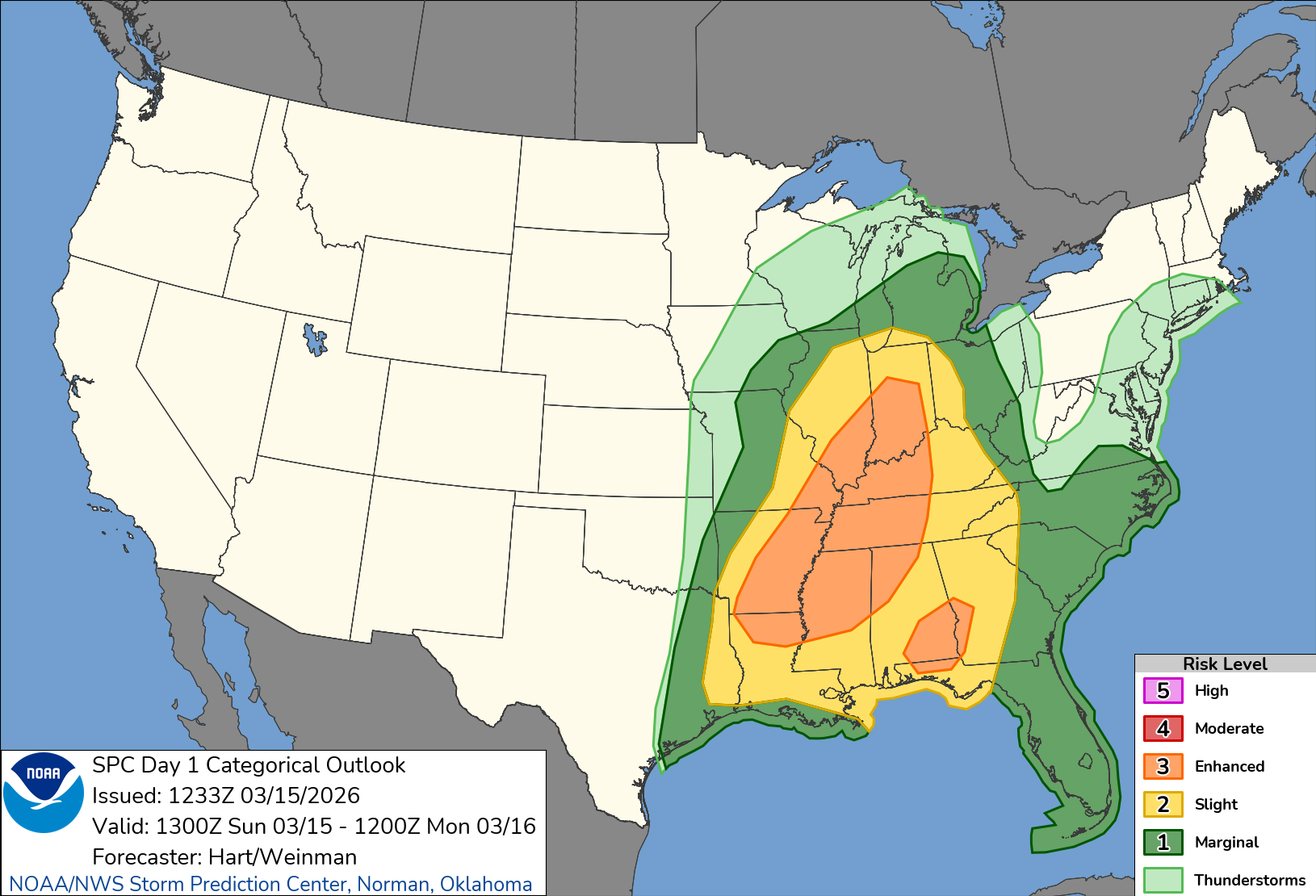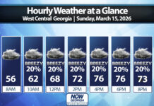 The Storm Prediction Center has placed all of North and Central Georgia under a slight (level 2/5) risk for severe storms on Sunday night. An enhanced risk (level 3/5) is in place to our west where storms are expected earlier in the day on Sunday. An additional small enhanced risk was added to south Alabama and far southwest Georgia including Columbus. This enhanced area may be removed in coming outlooks depending on how models handle the potential development of supercells ahead of the advancing line.