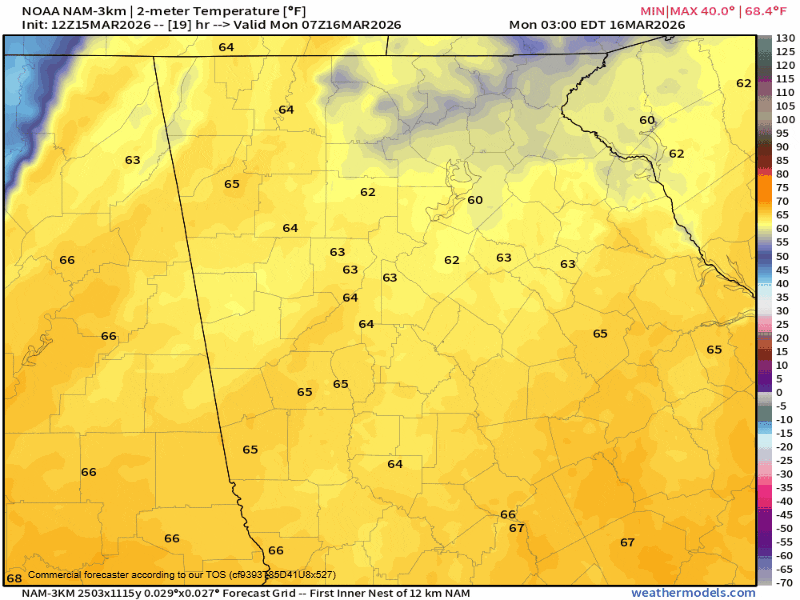 Behind the arctic front temperatures will go into free-fall mode. Temperatures will be in the low/mid-60s ahead of the front, but fall quickly into the 30s in the Northeast Georgia mountains and low/mid-40s elsewhere in its wake. Temperatures will be below freezing region-wide by midnight and lows on Tuesday morning are expected to bottom out in the low/mid-20s. A Freeze Watch is in effect for the entire state under the Peachtree City weather service office, but these temperatures are not at all unusual for this time of year.