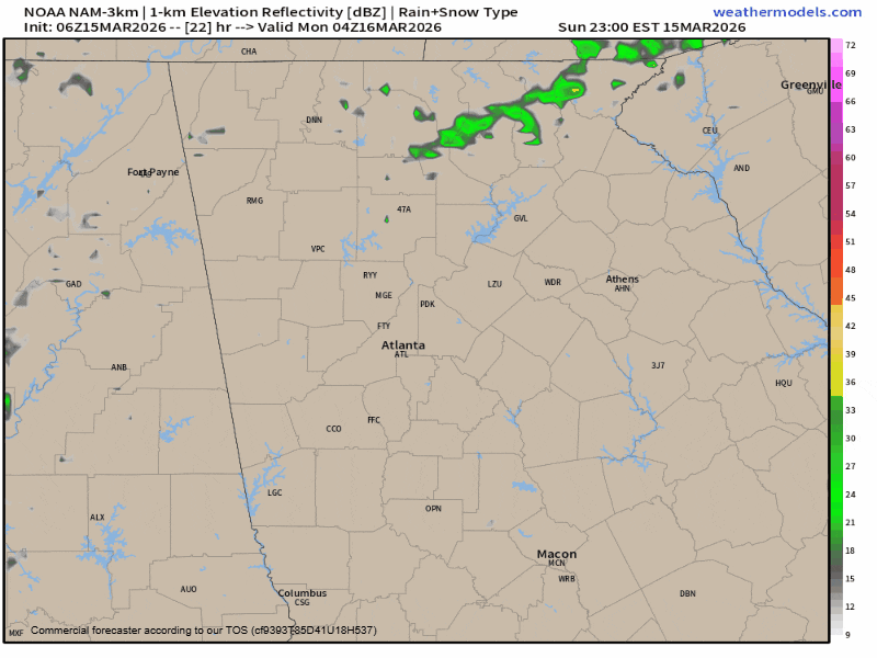 A line of strong to severe storms is likely to develop along or just ahead of a rapidly advancing arctic cold front during the day Sunday and race very quickly east. Additional storms may develop just in front of this line, of which some could also be strong/severe especially across Southwest Georgia. Current modeling shows the line arriving in northwest Georgia around 2 a.m. on Sunday night and quickly advancing east through 6-7 a.m. This will be a very quick moving line of storms with forward motion of 40-50 m.p.h. clearing the entire state in just a few hours.