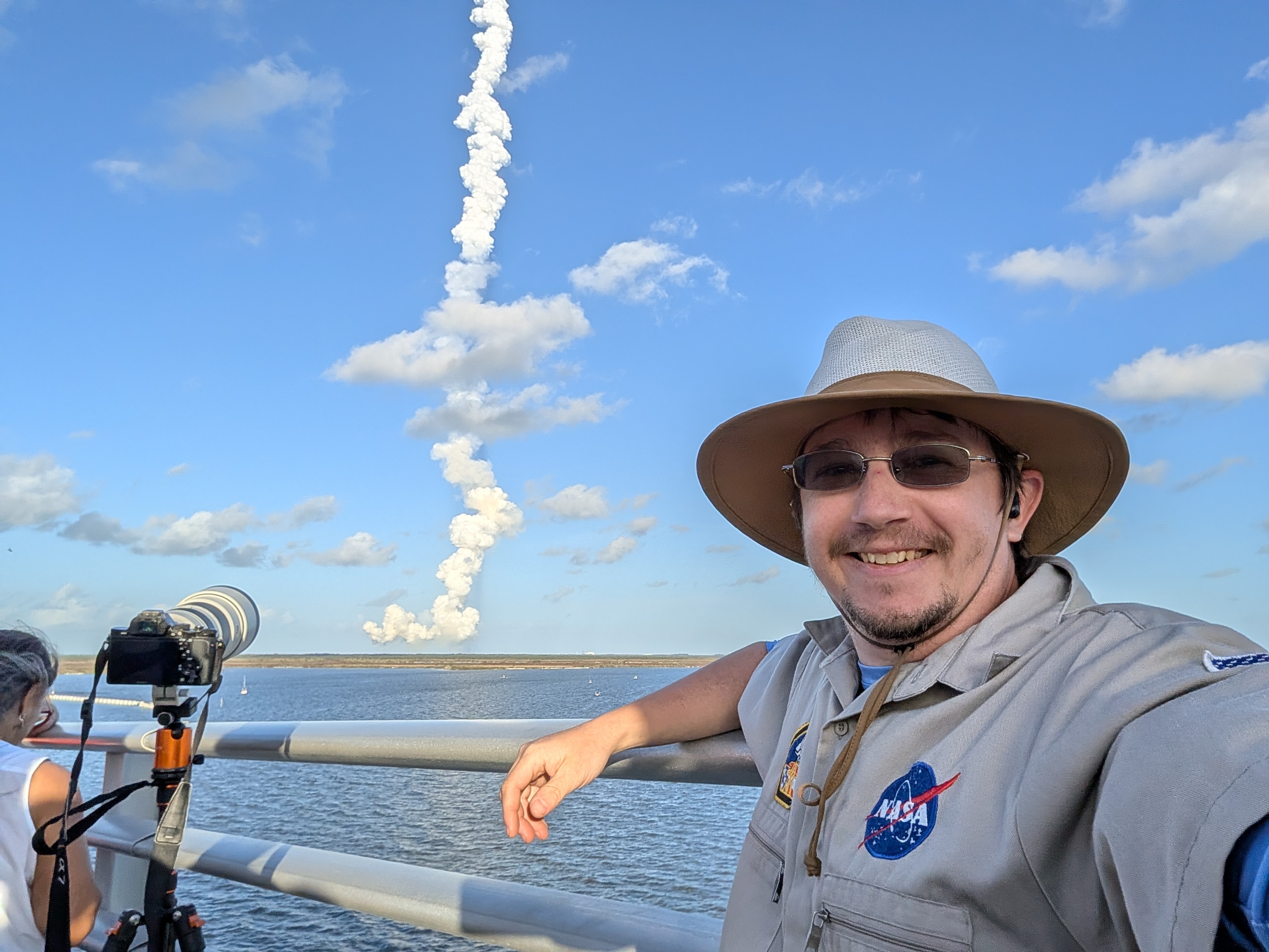 After launch, the eastward trajectory meant we weren’t able to see the booster separation from our location as the smoke plume sat between us and the rocket. Of course, I couldn’t resist getting a selfie with the rocket plume.