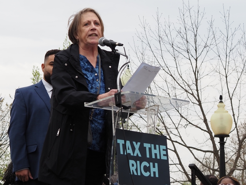 Several House and Senate Democrats spoke to the demonstrators, who wielded signs bearing the messages “Tax the Rich” and “Fair Taxes Now.”