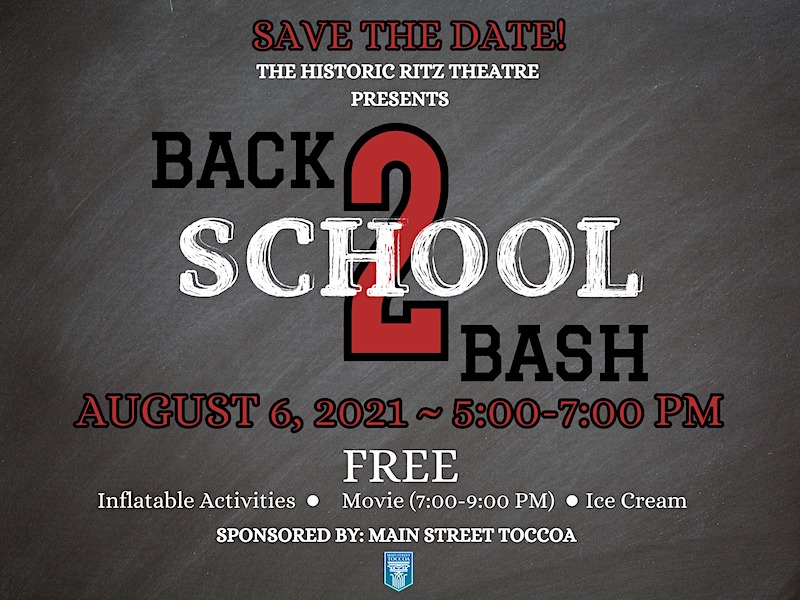 Spend Friday, August 6th, from 5-9 p.m. at the Historic Ritz Theatre in Toccoa for a fun-filled night of inflatable activities, ice cream, snowcones, school supplies, treats, and a movie all free of charge.