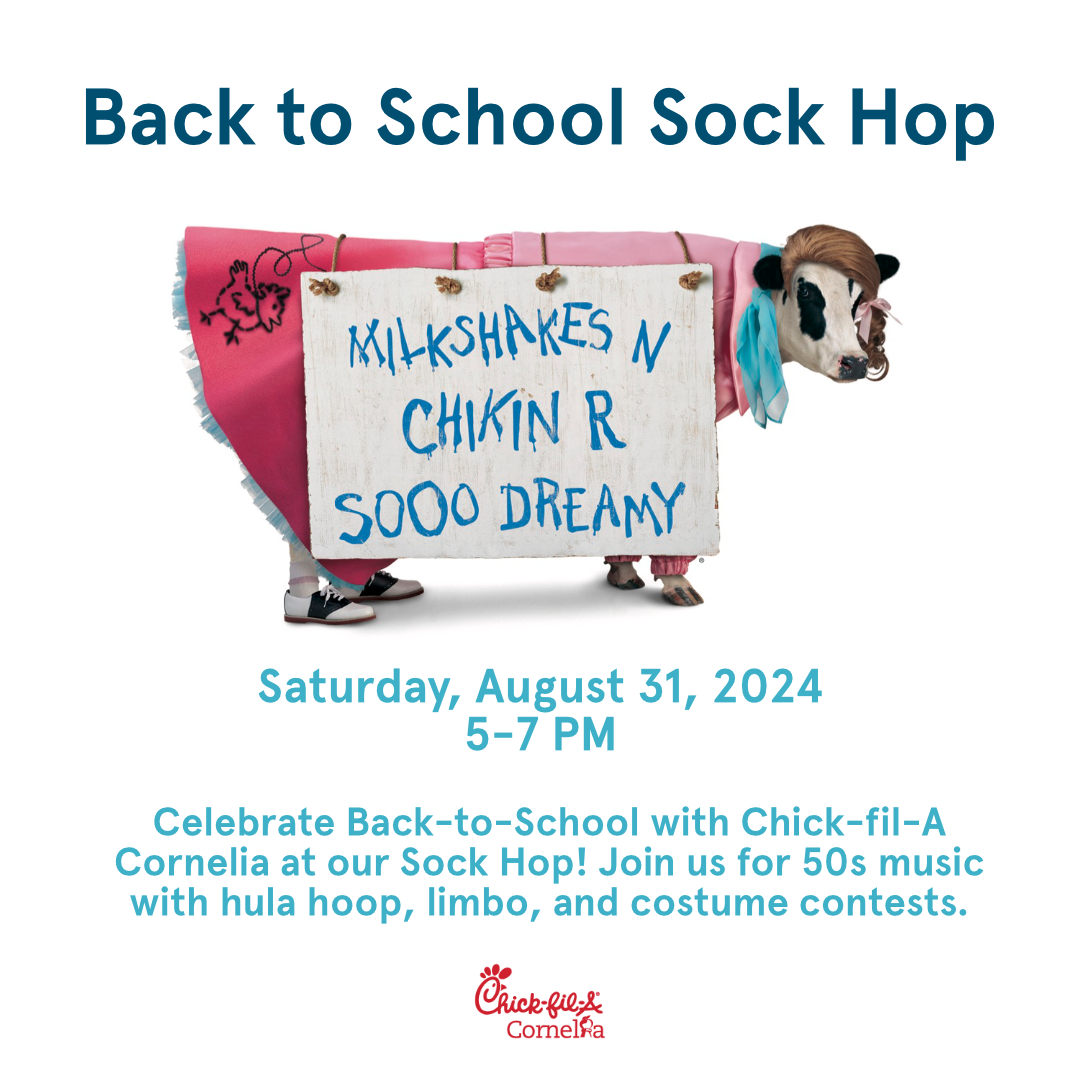 Christy Bowen, Chick-fil-A’s Talent and Marketing Director, said, “We are excited to host our first Back to School Sock Hop at Chick-fil-A Cornelia. It is going to be so much fun for everyone!”