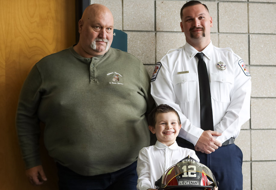 A proud young Colton Palmer shows off his dad’s fireman’s hat. Mack Palmer (right) was pinned as a Lieutenant in the Habersham County Emergency Services on Jan. 17, 2020. He and Colton are joined by Mack’s father, Bruce Palmer. (Daniel Purcell/Now Habersham)