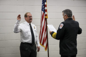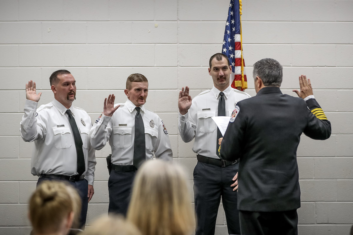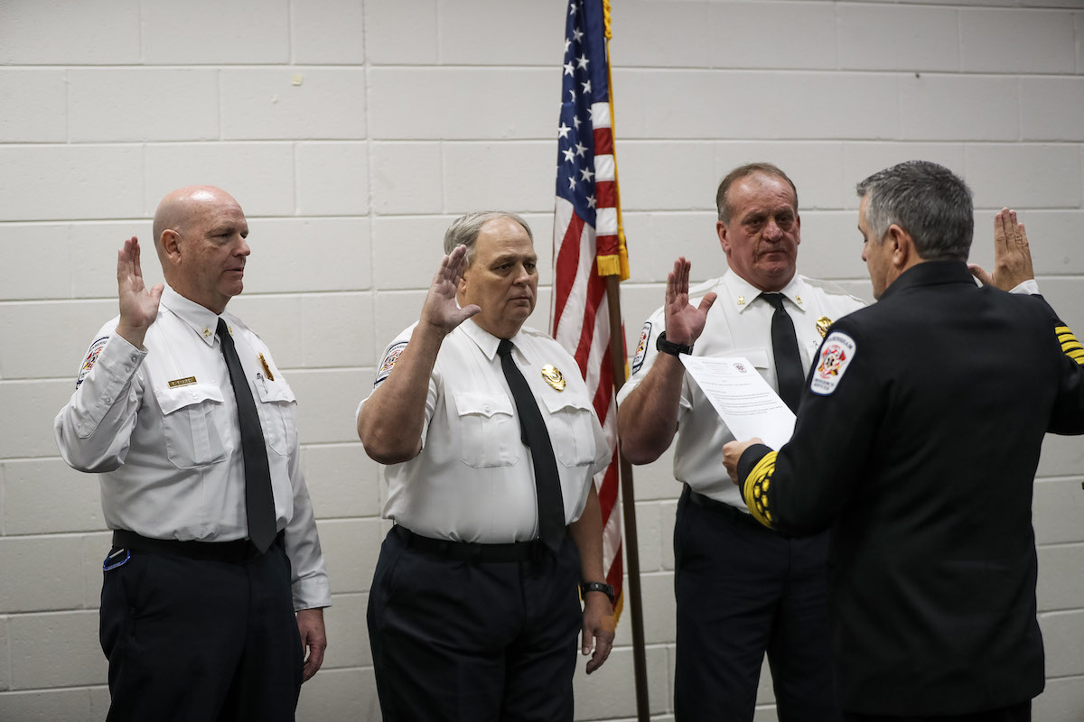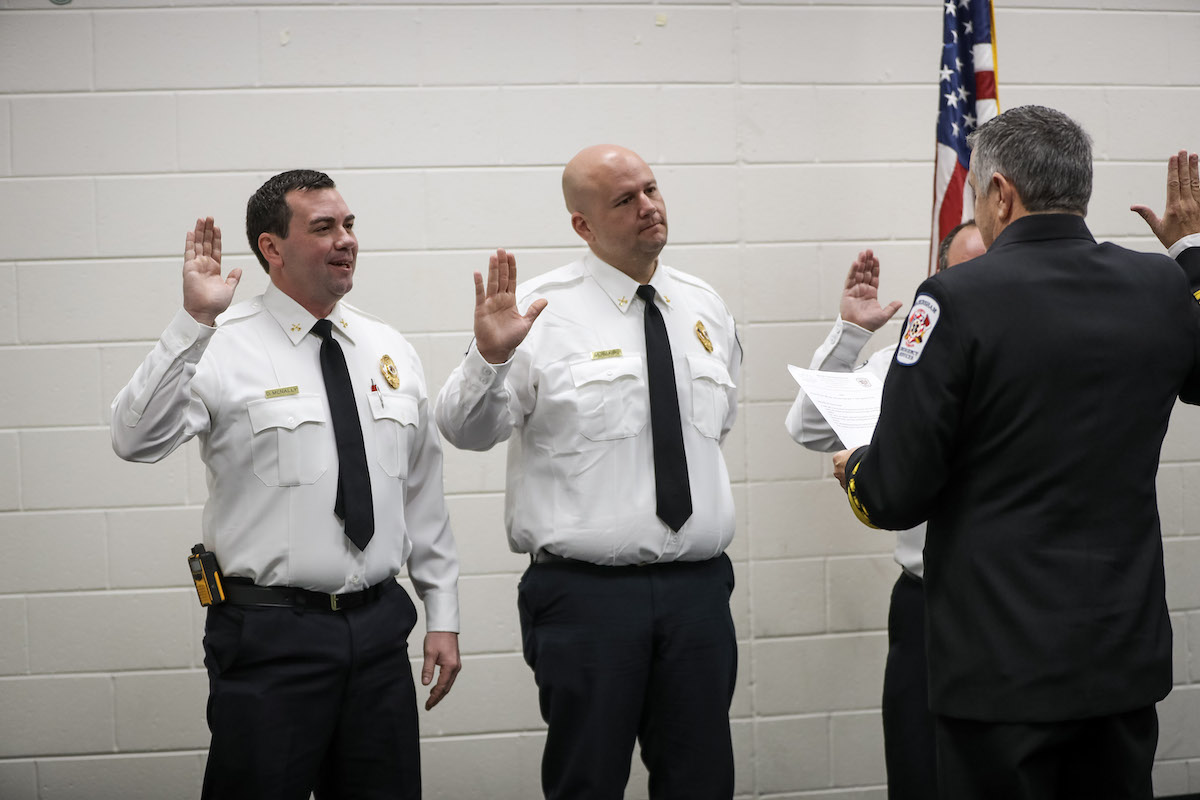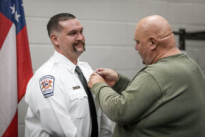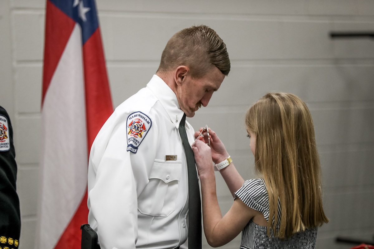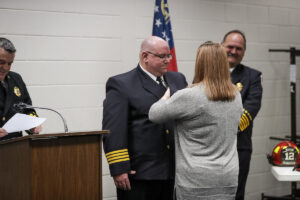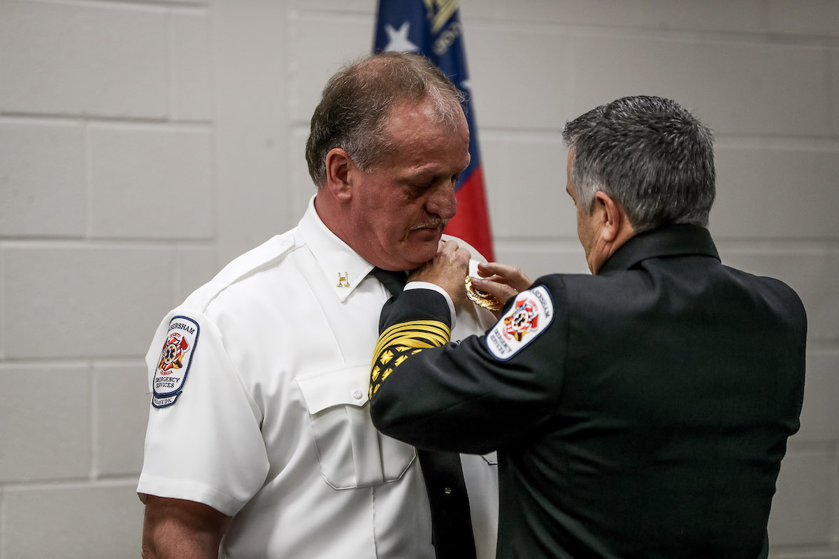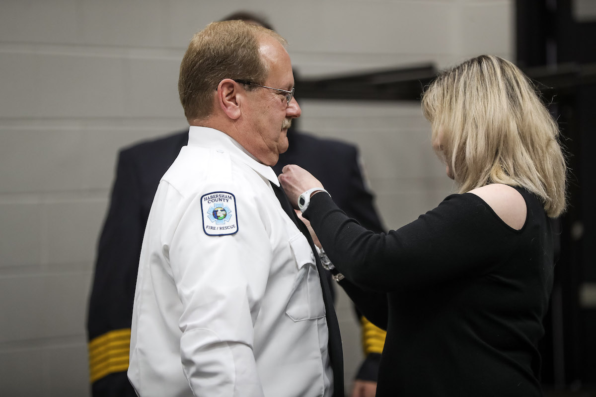 Monica Dean pins a lieutenant’s badge onto her fiancé Joseph Deal’s uniform. Lieutenant Deal has served 10 years as a firefighter, 3 with Habersham County. (Daniel Purcell/Now Habersham)Cecelia Fields pins a lieutenant’s badge onto the uniform of her father, Brandon Fields. Lt. Fields has served 18 years as a firefighter and has been with Habersham County since April 15, 2018. In addition to his daughter, Lt. Fields’ wife Megan, daughter Hollis, mother Bobbie Lynn, and aunt and uncle Peggy and Russell James attended the ceremony. (Daniel Purcell/Now Habersham) Bruce Palmer pins a lieutenant’s badge onto the uniform of his son, Mack Palmer. Lieutenant Palmer has been a firefighter for 12 years and has served 14 months in Habersham County. Lt. Palmer’s wife Skyler, son Colton, and brothers James and Eric Palmer also attended the ceremony. (Daniel Purcell/Now Habersham)HCES Lieutenants Palmer, Fields, and Deal take the HCES oath during their pinning ceremony in Clarkesville on Jan. 17, 2020. (Daniel Purcell/Now Habersham)Pictured L-R: HCES Lieutenants Palmer, Fields, and Deal. (Daniel Purcell/Now Habersham)Habersham County Emergency Services Director Chad Black pins a captain’s badge onto the uniform of Michael Alexander. Capt. Alexander has served in public safety in Habersham County for more than 32 years. (Daniel Purcell/Now Habersham)Habersham County Emergency Services Director Chad Black pins a captain’s badge onto the uniform of Doug Caudell. Capt. Caudell has served in public safety in Habersham County for over 36 years. (Daniel Purcell/Now Habersham)Habersham County Emergency Services Director Chad Black pins a captain’s badge onto the uniform of Bill Ramsey. Capt. Ramsey has served in public safety in Habersham County for over 36 years. (Daniel Purcell/Now Habersham)Pictured L-R: HCES Captains Ramsey, Caudell, and Alexander take the HCES oath during their pinning ceremony in Clarkesville on Jan. 17, 2020. (Daniel Purcell/Now Habersham)Sharon Adams pins a captain’s badge onto the uniform of her husband Jeff Adams. Capt. Adams has been in public safety for 28 years. (Daniel Purcell/Now Habersham)Capt. Jeff Adams takes the HCES oath during his badge pinning ceremony in Clarkesville on Jan. 17, 2020. (Daniel Purcell/Now Habersham)Melissa Garrett pins a battalion chief’s badge onto the uniform of her husband Jason Garrett. Battalion Chief Garrett has served in public safety for 26 years, 20 in Habersham County. His daughter McKinlee and mother-in-law Terri Cheek also attended the ceremony. (Daniel Purcell/Now Habersham) April Ruark pins a battalion chief’s badge onto the uniform of her husband Matt Ruark. Battalion Chief Ruark has served 18 years in public safety in Habersham County. His daughter Teagen also attended the ceremony. (Daniel Purcell/Now Habersham)Jenny McNally pins a battalion chief’s badge onto the uniform of her husband Dwight McNally. Battalion Chief McNally has spent 18 years in public service, 17 with Habersham County. (Daniel Purcell/Now Habersham)Pictured L-R: HCES Battalion Chiefs Dwight McNally, Matt Ruark, and Jason Garrett take the HCES oath during their badge pinning ceremony in Clarkesville on Jan. 17, 2020. (Daniel Purcell/Now Habersham) Tinnelle Davey pins an assistant chief’s badge onto the uniform of her husband Jason Davey. Asst. Chief Davey has served in public safety for 27 years, 20 with Habersham County. (Daniel Purcell/Now Habersham)Assistant Chief Jason Davey takes the HCES oath during his badge pinning ceremony in Clarkesville on Jan. 17, 2020. (Daniel Purcell/Now Habersham)