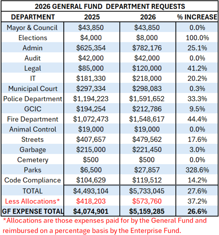 The Baldwin City Council began discussions Thursday on the city’s proposed departmental budgets for the 2026 fiscal year, reviewing requests totaling $5,159,285 from department heads. The proposals mark a significant $1,084,384 increase over last year’s general fund budget.