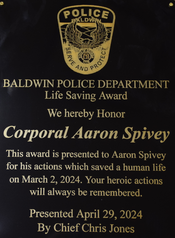 Corporal Aaron Spivey from the Baldwin Police Department and Officer Jackson Cooter from the Cornelia Police Department received a plaque from Chief Jones commending them for their actions.