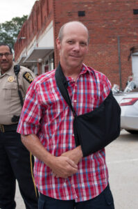 With his left arm in a sling and a smile on his face, Baldwin Fire Chief Joe Roy made his way through the crowd Saturday thanking his fellow public safety officers and supporters. “The recovery has been rough, but I am getting better every day,” Roy assured them. The scene yesterday was a far cry from where Roy was just three weeks ago.