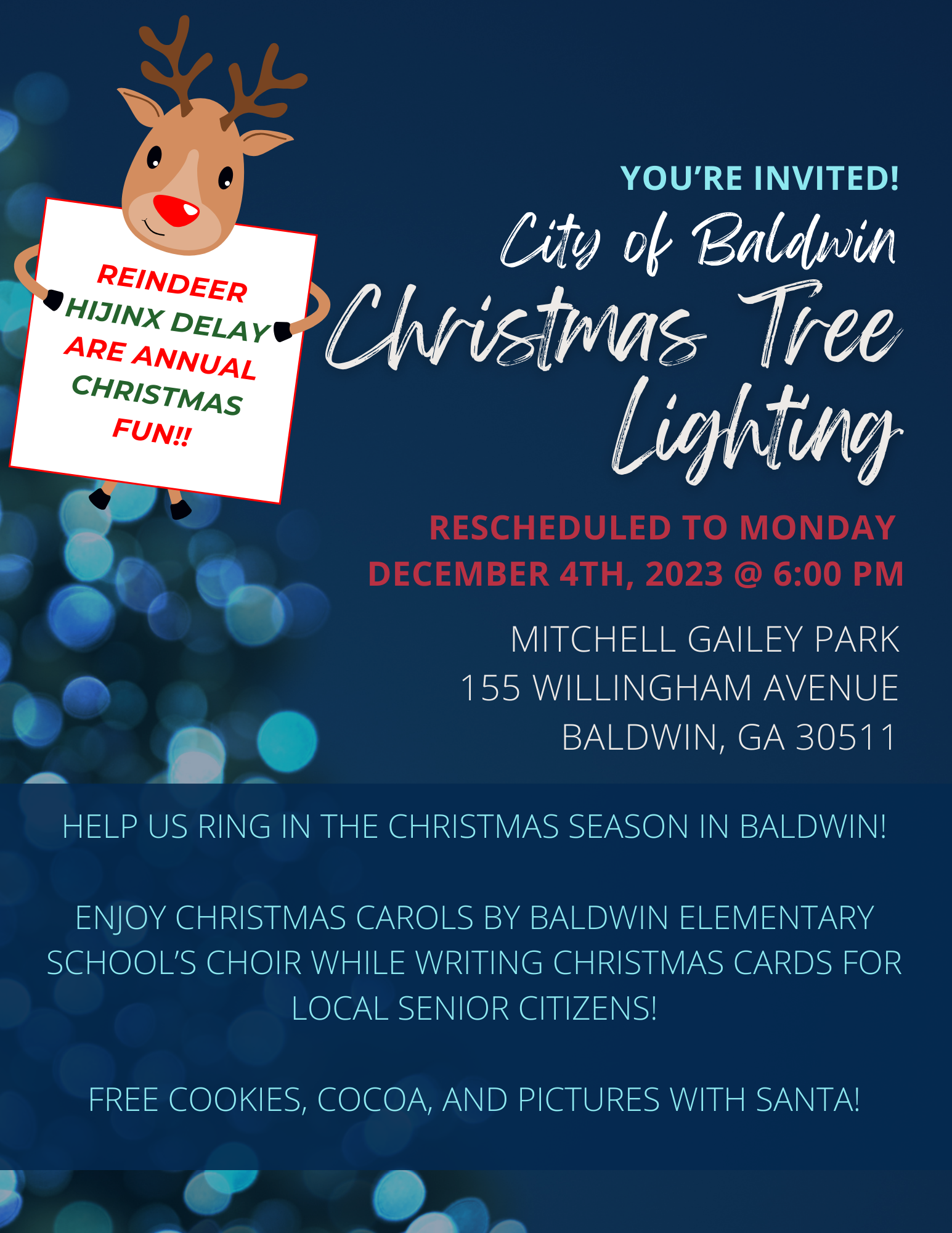 The city of Baldwin late Thursday announced it has postponed its annual Christmas tree lighting due to the threat of inclement weather. The event, which was originally scheduled to take place on Friday, is now scheduled for 6 p.m. Monday, Dec. 4, at Mitchell Gailey Park.