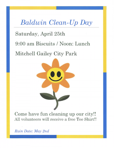 It’s time for spring cleaning in the city of Baldwin. The annual Baldwin Clean-Up Day will be held April 25. City Manager Tommie Perry says volunteers are needed to help pick up litter and trash around town.