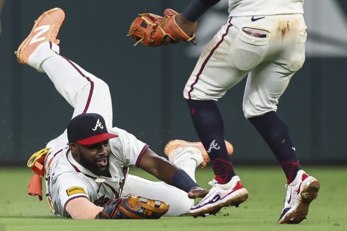 Atlanta Braves outfielder Michael Harris II makes a sliding catch in the ninth inning of a baseball game against the Chicago White Sox, Tuesday, Aug. 19, 2025, in Atlanta. (AP Photo/Colin Hubbard)