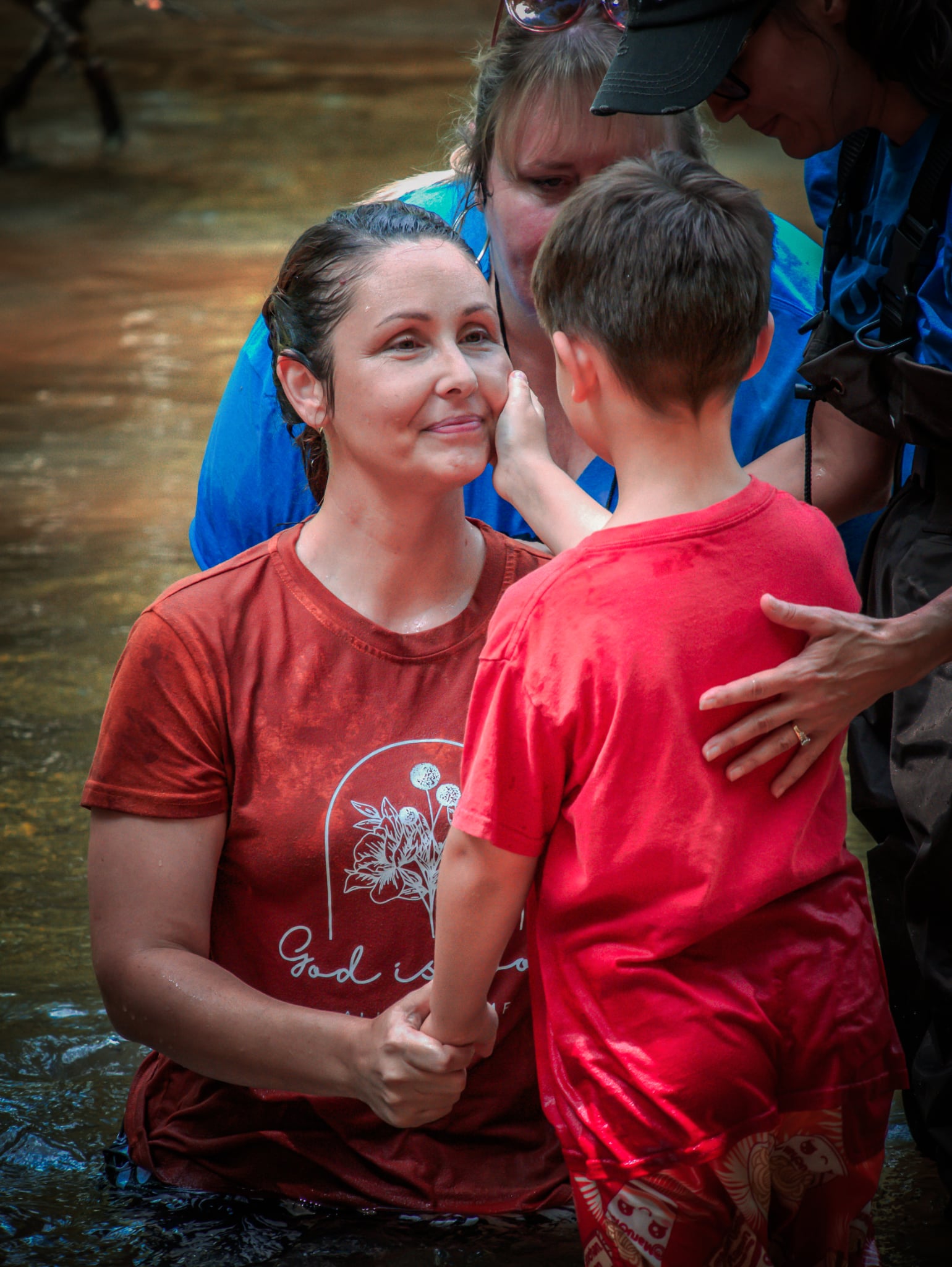 Natasha Dove searched her son’s eyes as he gently touched her face while she rose from the water. She was among seven who were baptized July 13, 2025, in the Soque River during an open community baptism. Another is planned for August 16. (Photo by Vickie Skelton)