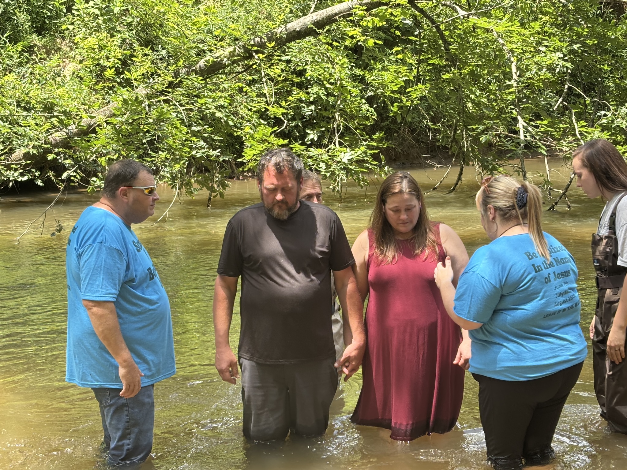 T.J. and Ginger Chappell pray at their baptism on July 12, 2025. The couple reunited after the death of their son. They came to the river seeking hope and healing. (Photo by Joshua M. Peck)