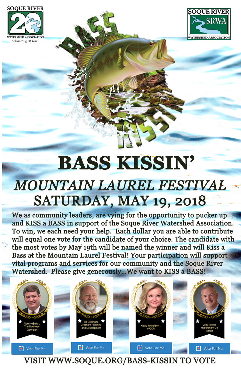 Four Habersham Countians are vying for the chance to kiss a bass on stage during the annual Mountain Laurel Festival this coming weekend. The contest is a fundraiser for the Soque River Watershed Association (SRWA).