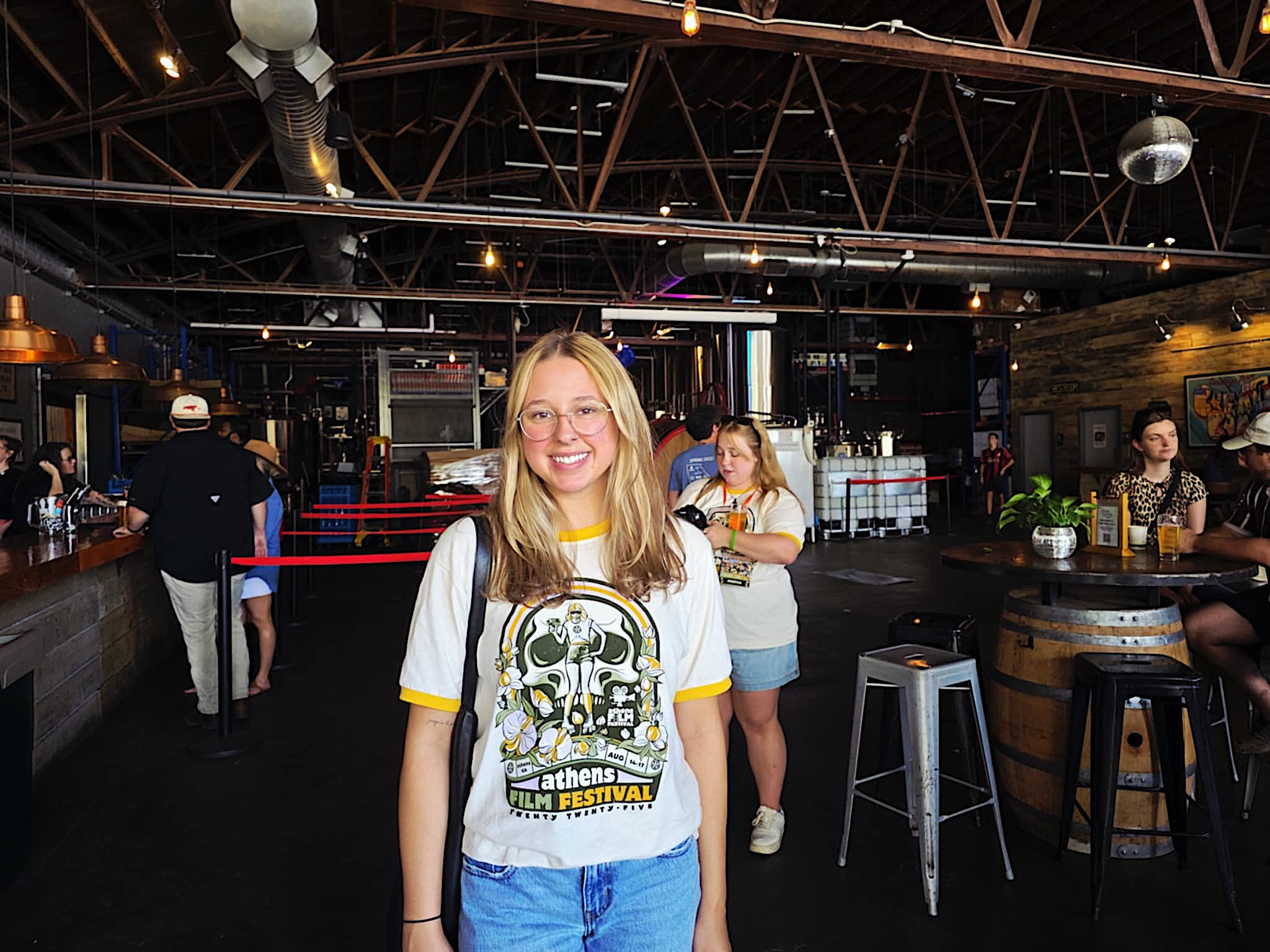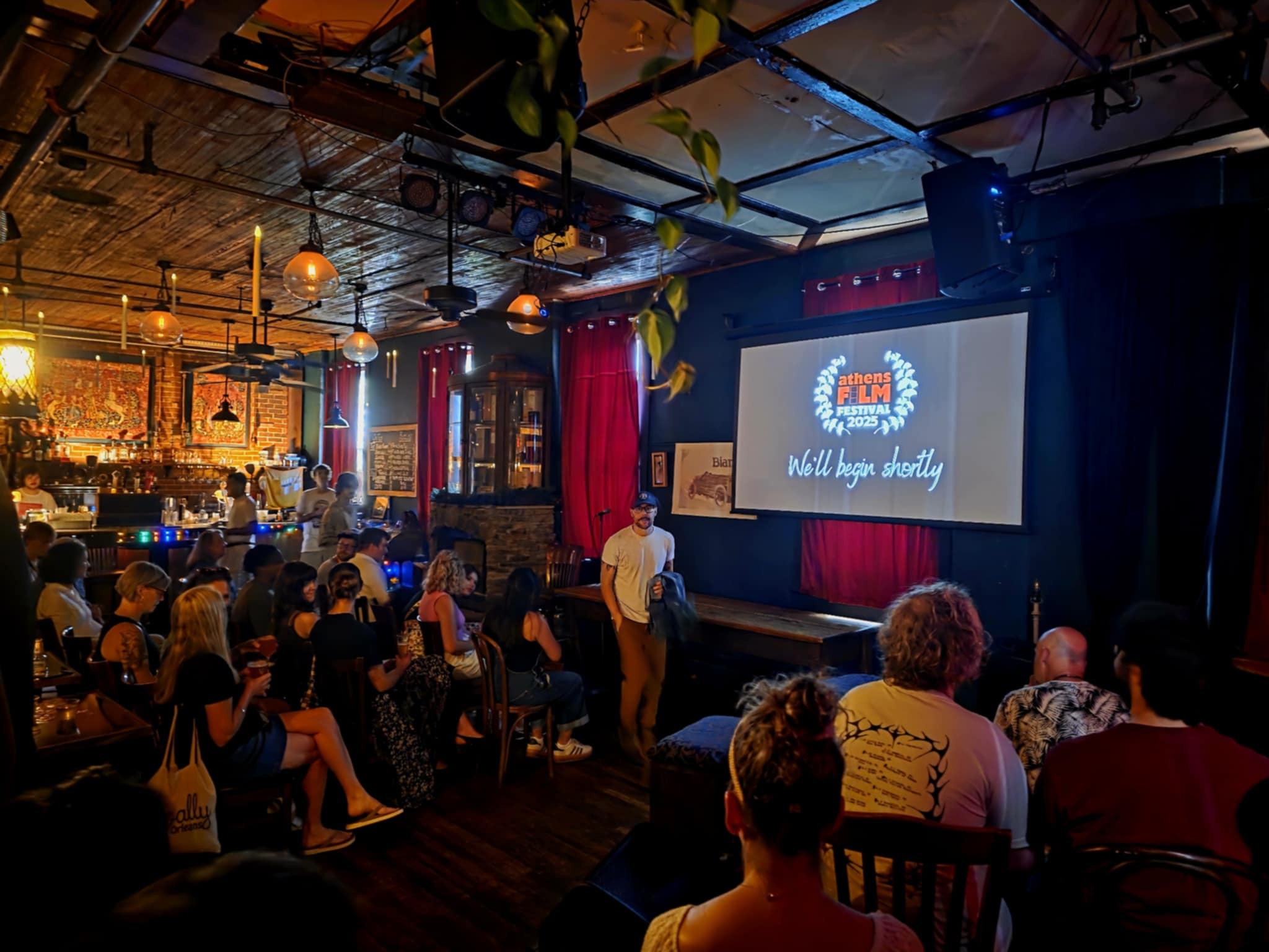 During the narrative shorts block at The Globe, the atmosphere matched the films: youthful, sharp, and buzzing with opinions. The venue itself set the stage, a beloved Athens institution where old wood floors creak underfoot, heavy red curtains frame the stage, and mismatched tables gather students, professors, and locals alike. Candle-shaped lights hung from the ceiling, lending the room warmth, while the hum of conversation floated up to the exposed beams.
