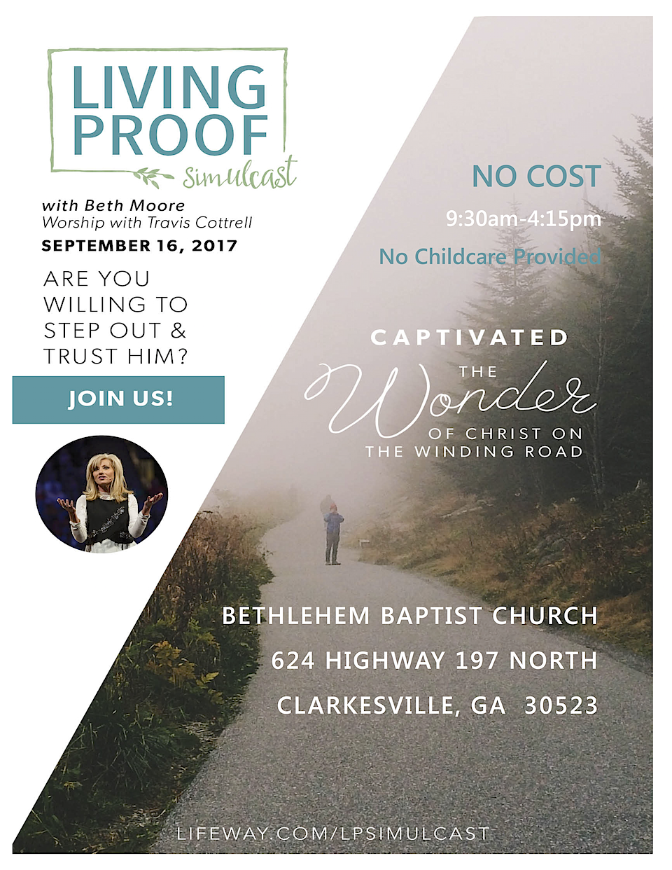 Bethlehem Baptist Church of Clarkesville will host a FREE Beth Moore simulcast on Saturday, Sept. 16 from 9:30 a.m.-4:15 p.m. at the church located on 624 Highway 197 North, Clarkesville, GA 30523.