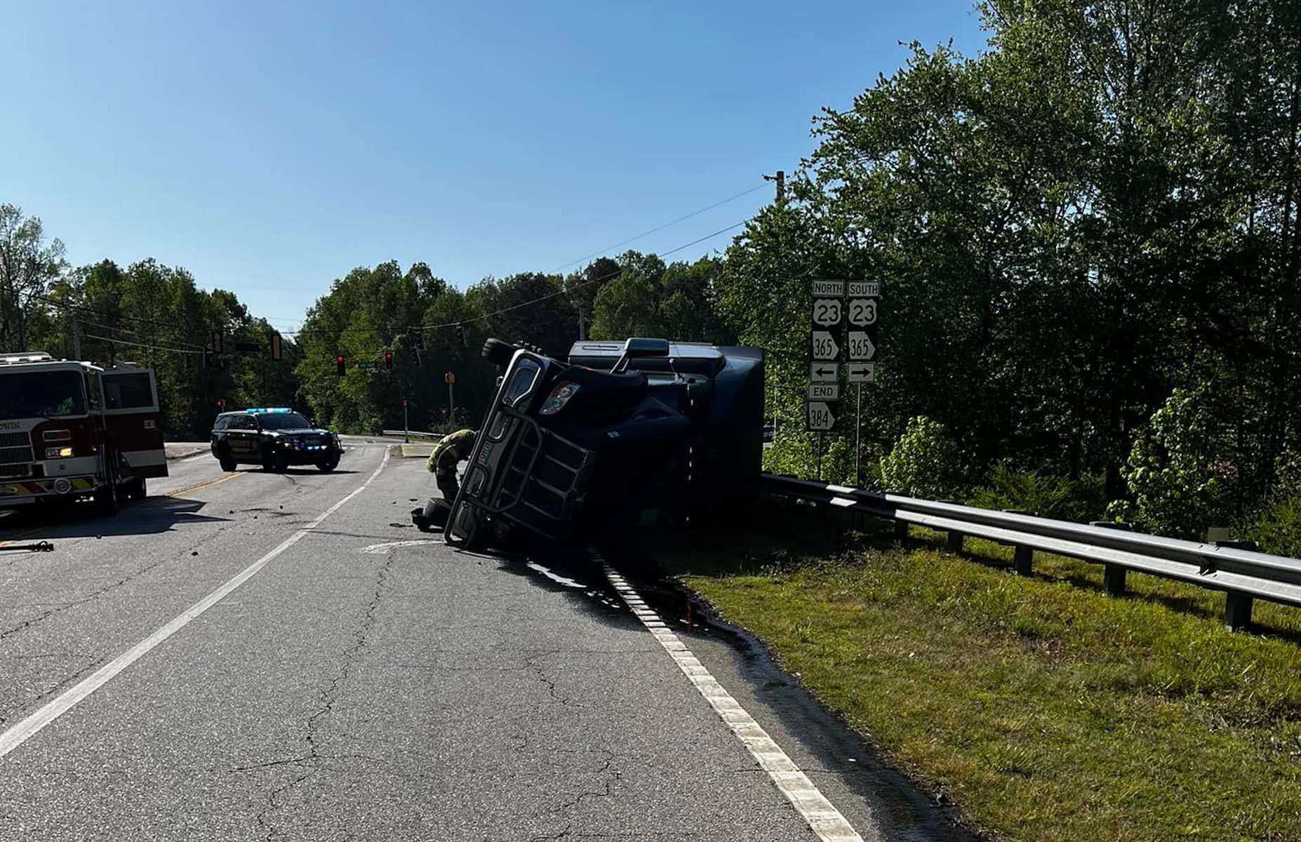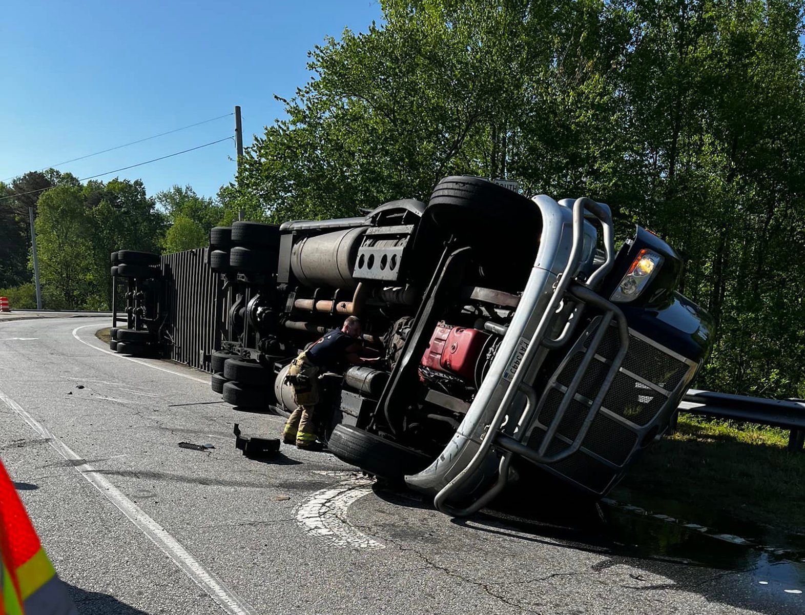 According to the Georgia State Patrol, the brakes on the 2014 Peterbilt rig failed, causing the driver to make an evasive maneuver. The southbound truck turned right onto Duncan Bridge Road but was traveling “too fast through the turn,” GSP says. The truck overturned on the driver’s side, striking its top on the guardrail.