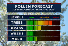 A Cold Weather Warning is in effect until 1:00 pm on Sunday, February 1. Dangerously cold wind chills ranging from as cold as 15 degrees below in the north Georgia mountains to the single digits above zero in north and central Georgia.