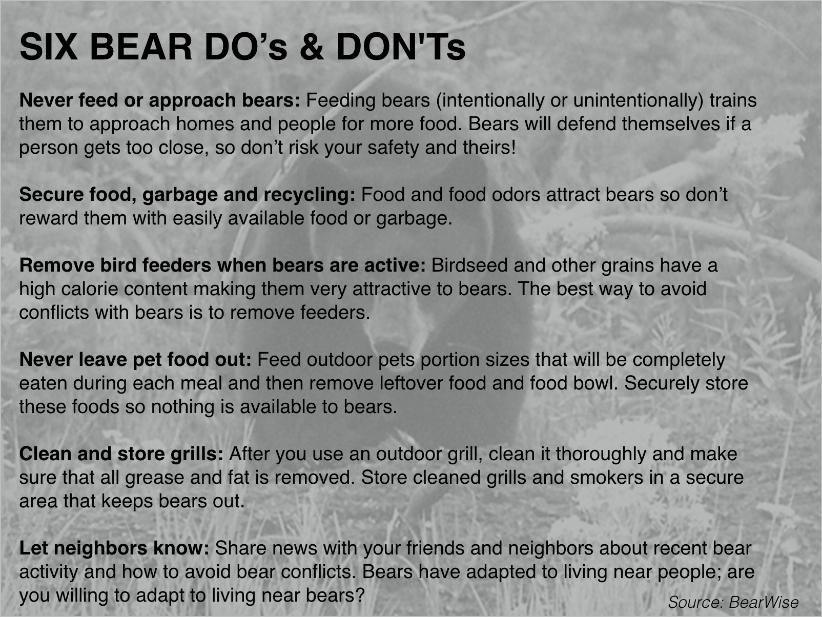 If you do encounter a bear, avoid it. “Go the other direction away from it. Don’t run, don’t scream, don’t holler,” advises Higgins. The point is to get away from the bear, not antagonize it. And be aware, you can’t legally just grab your gun or some other weapon and kill it. “Bear season is closed,” Higgins cautions. “If they attack you, you always have the right to protect yourself and property but you have to be able to prove the bear attacked you.”