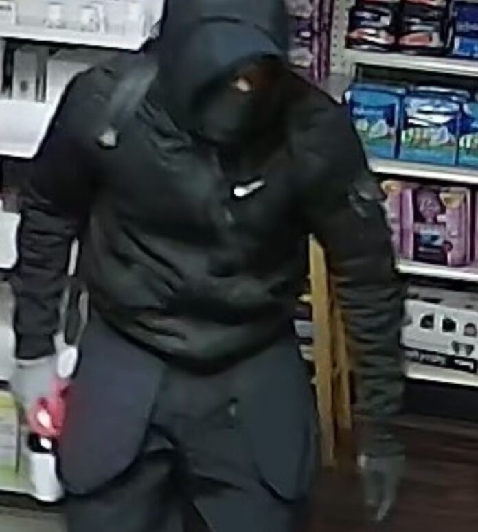 Video surveillance shows an unknown person, dressed all in dark clothing with face and hands covered, break into the pharmacy and attempt to access the controlled substance cabinet. When the subject could not access the cabinet, he took one bottle of over-the-counter cough syrup and fled the scene through the broken window.