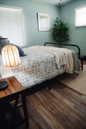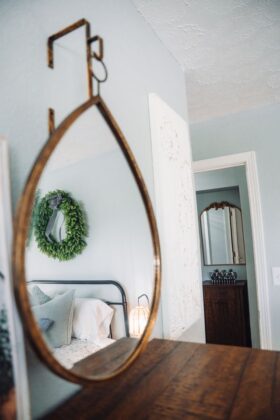 The Tiffany Room takes on a Dutch milkmaid aesthetic with a blue-and-white palette, with glass pitchers and pressed florals. Next door, the Bridal Suite offers a quiet, romantic space. A cross hangs above the door, antique silver handheld mirrors rest in front of salon stations, and a Bible sits on a dresser. Yet, the Rose Room is the most personal. Amanda filled it with soft pinks and mismatched teacups, each one a gift from neighbors, friends, or visitors.