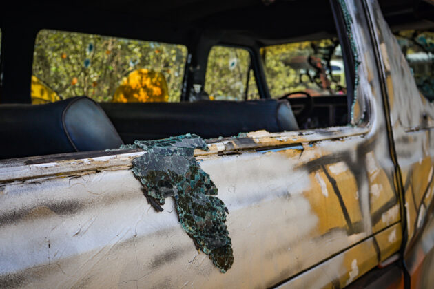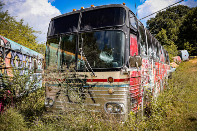 The School Bus Graveyard in Alto, where row upon row of buses have been turned into canvases of color, was struck by what its owners, Debbie and Walter Wade, are calling the worst act of vandalism they’ve ever seen. Windows were smashed out of painted buses, personal cars were damaged, and even grading equipment used to maintain the property was targeted.