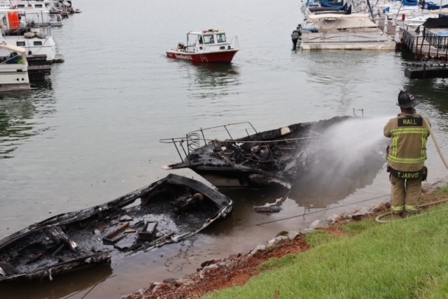 At 7:45 p.m., Hall County Fire Rescue Public Information Officer Kimberlie Brady announced “all three boats are no longer on fire and are completely extinguished.” Firefighters towed the charred remains to shore to make sure the boats were no longer a threat.
