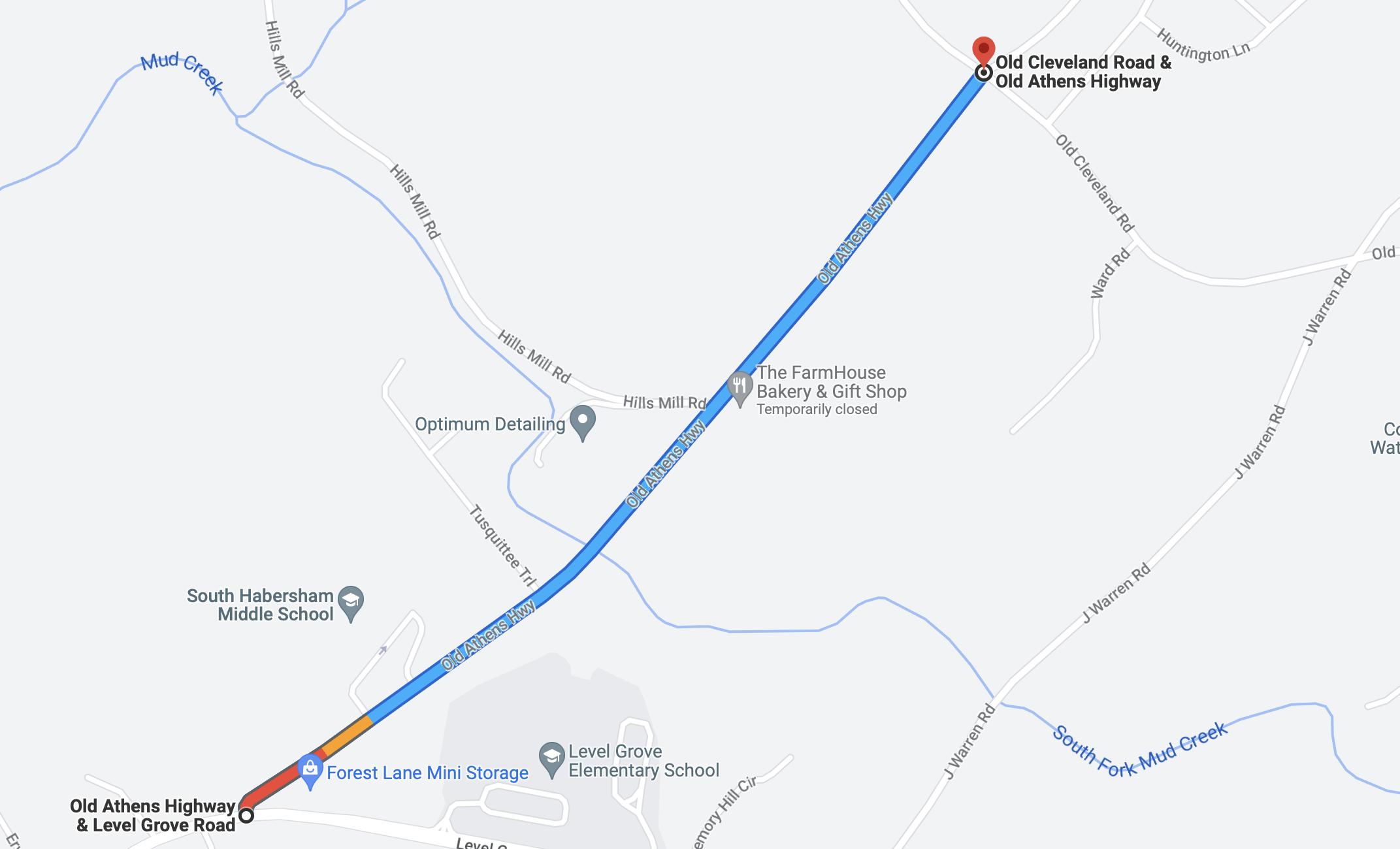 The advisory is in effect from the intersection of Old Cleveland Road and Old Athens Highway south to the intersection of Old Athens Highway and Level Grove Road.