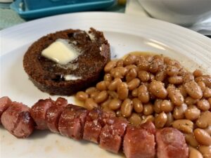 Although it was never served this way at house, brown bread is normally served with blacked grilled hot dogs and baked beans with molasses. To be honest, the plate does not look appetizing to me personally.