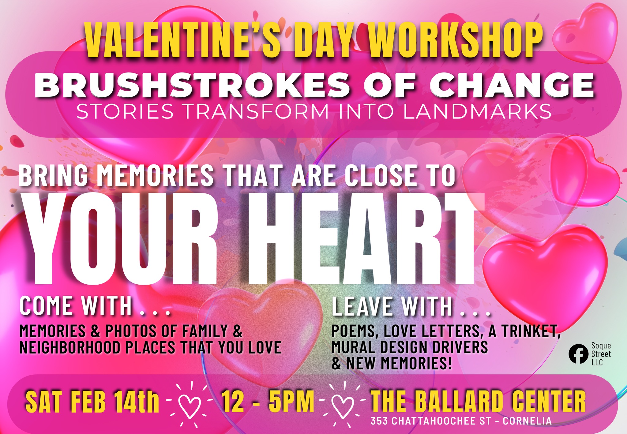 CORNELIA, Ga. — The community art initiative Brushstrokes of Change will host a Valentine’s Day workshop Saturday at the Ballard Center, inviting residents to bring personal memories and help shape future public art projects.