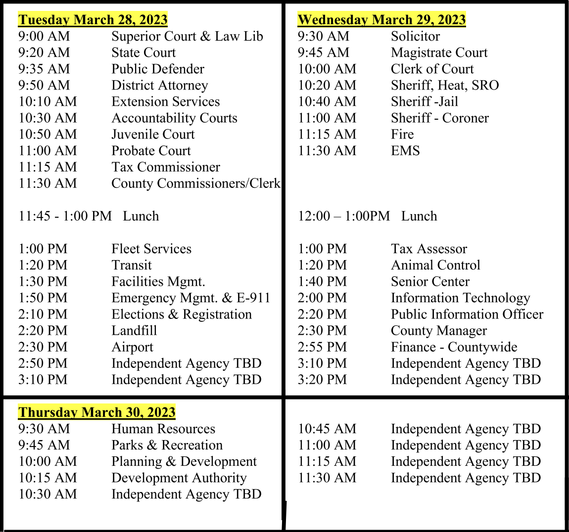 Habersham County 2023 Departmental Budget Review meeting schedule (Source: Habersham County Public Information)