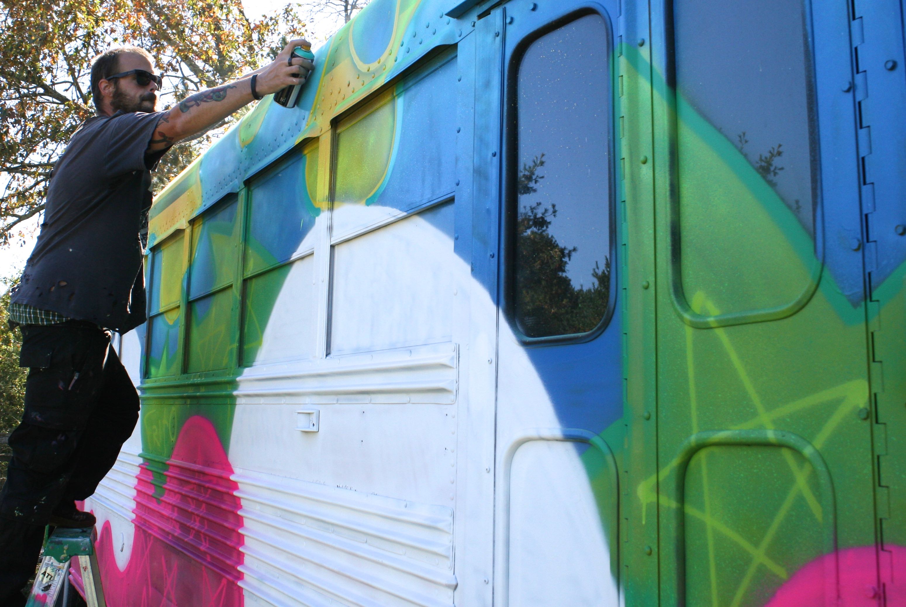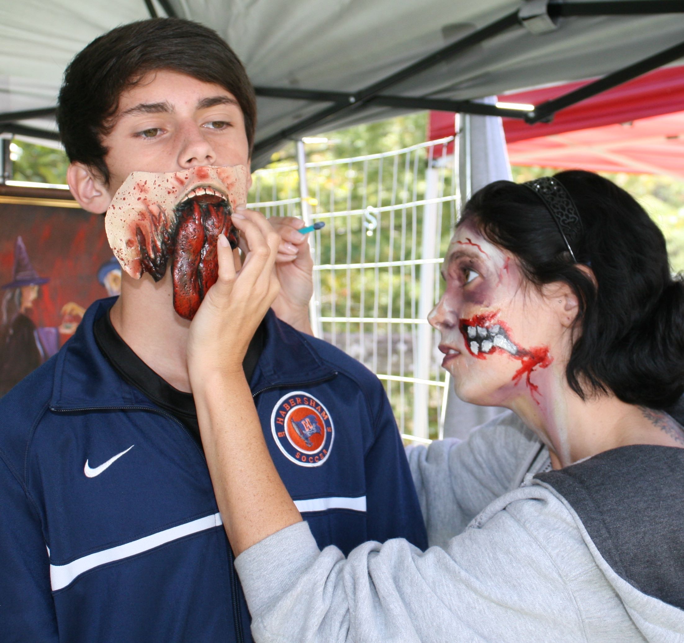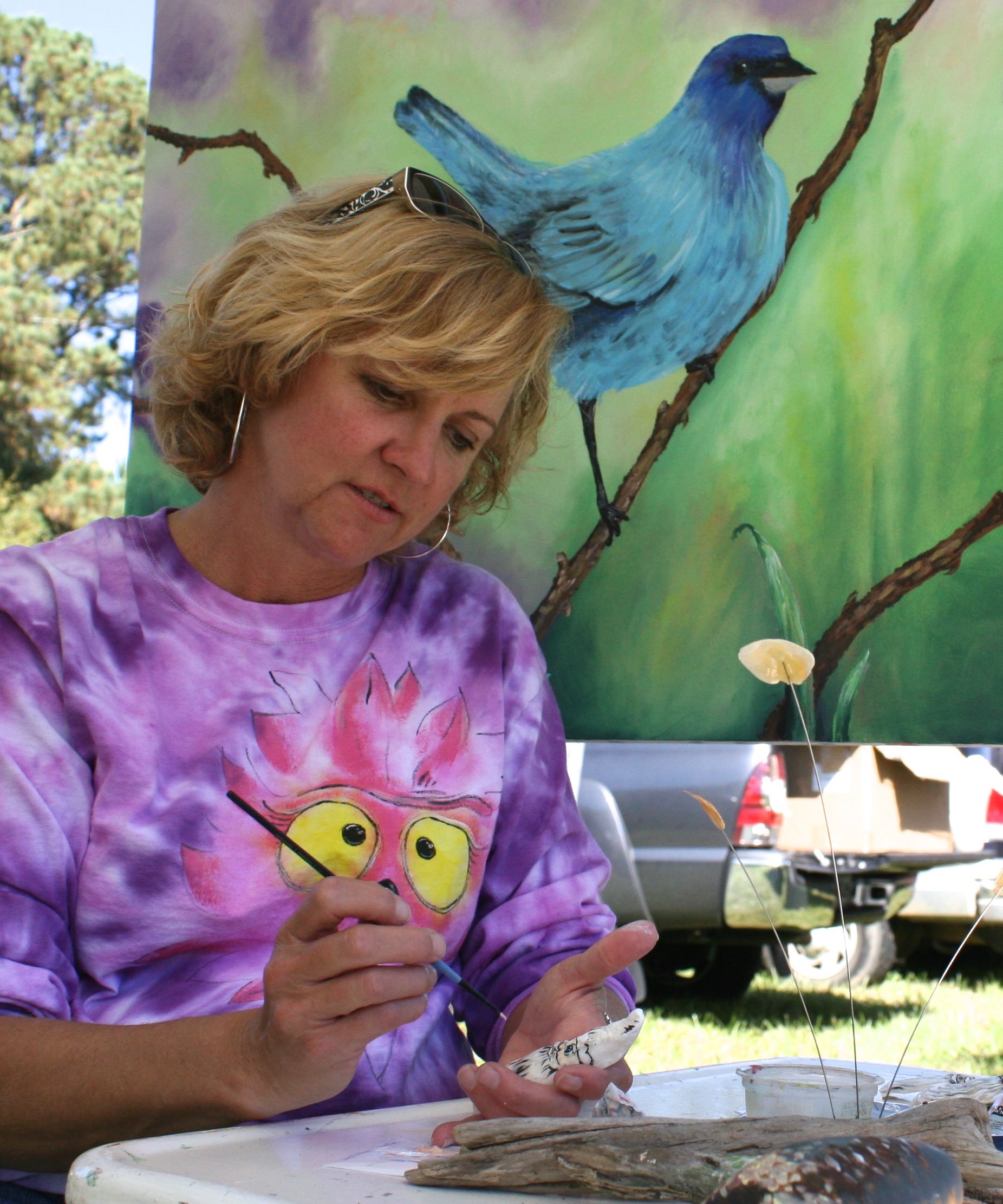 Folk artist Sam Granger of Lula models his “liberty” hat.Nick Morris of Cornelia turns a bus into a colorful mural. Nick, along with his wife Amanda, used an estimated 30 cans of environmentally friendly spray paint for this project. The bus was provided by Alonzo Wade of Alto. The Morris’s own Crispy Printz in Cornelia.Peter Loose of Hull, Ga. adds details to snakes he painted on a parasol.Anne Mayton of Clarkesville looks at pottery crafted by Polly Sherrill of Atlanta.Sabrina Sloat uses her artistic talents to help turn her son Ian Sloat into a temporary zombie. They were preparing for the Kiwanis Zombie Fun Run to be held in Clarkesville later that day. Ian later got the final artistic touches applied by Candace Crowe of Celtic Crow Tattoo in Clarkesville.Jill Haack of “Art in Jill’s Garden” in Gainesville paints Santa Claus faces on oyster shells she picked up at Edisto Island, S.C.Sunny skies encouraged hundreds of art lovers to attend the Fall Artfest 2014 held Saturday at the Burnt Burbon Pottery Gallery and Studio at 330 Foster St. in Cornelia. Event organizer Anne Crocker Christol said they had 78 artists, some of national and international acclaim showing their artwork. Christol said she was “thrilled to death by the turnout and the level of artistic talent represented. It’s a fun event.” In addition to the copious displays of art, there was music, food, and libations available.