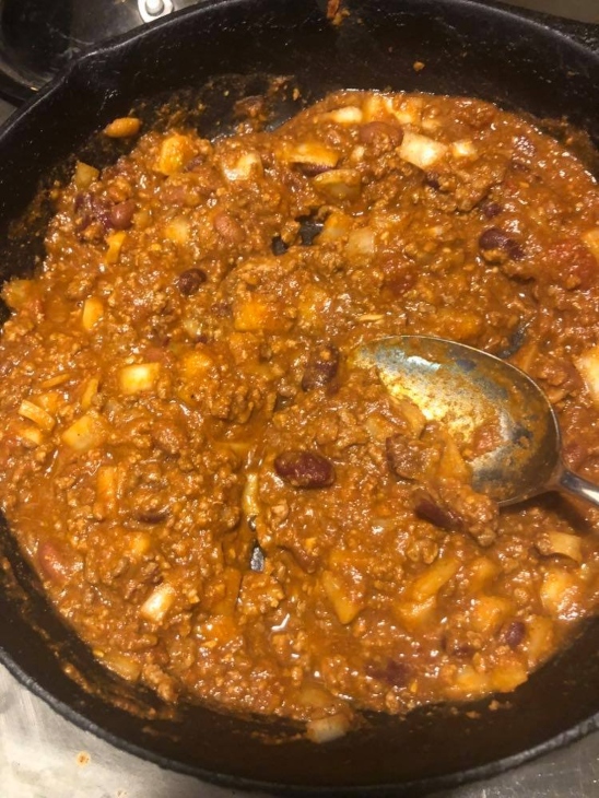 Add the chili, spaghetti sauce, onion, garlic, and seasonings to a black iron skillet and heat until bubbling. Add a little water if it’s too thick.