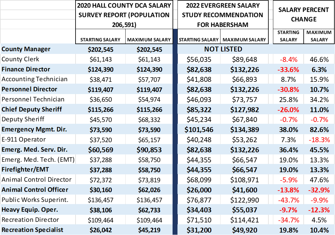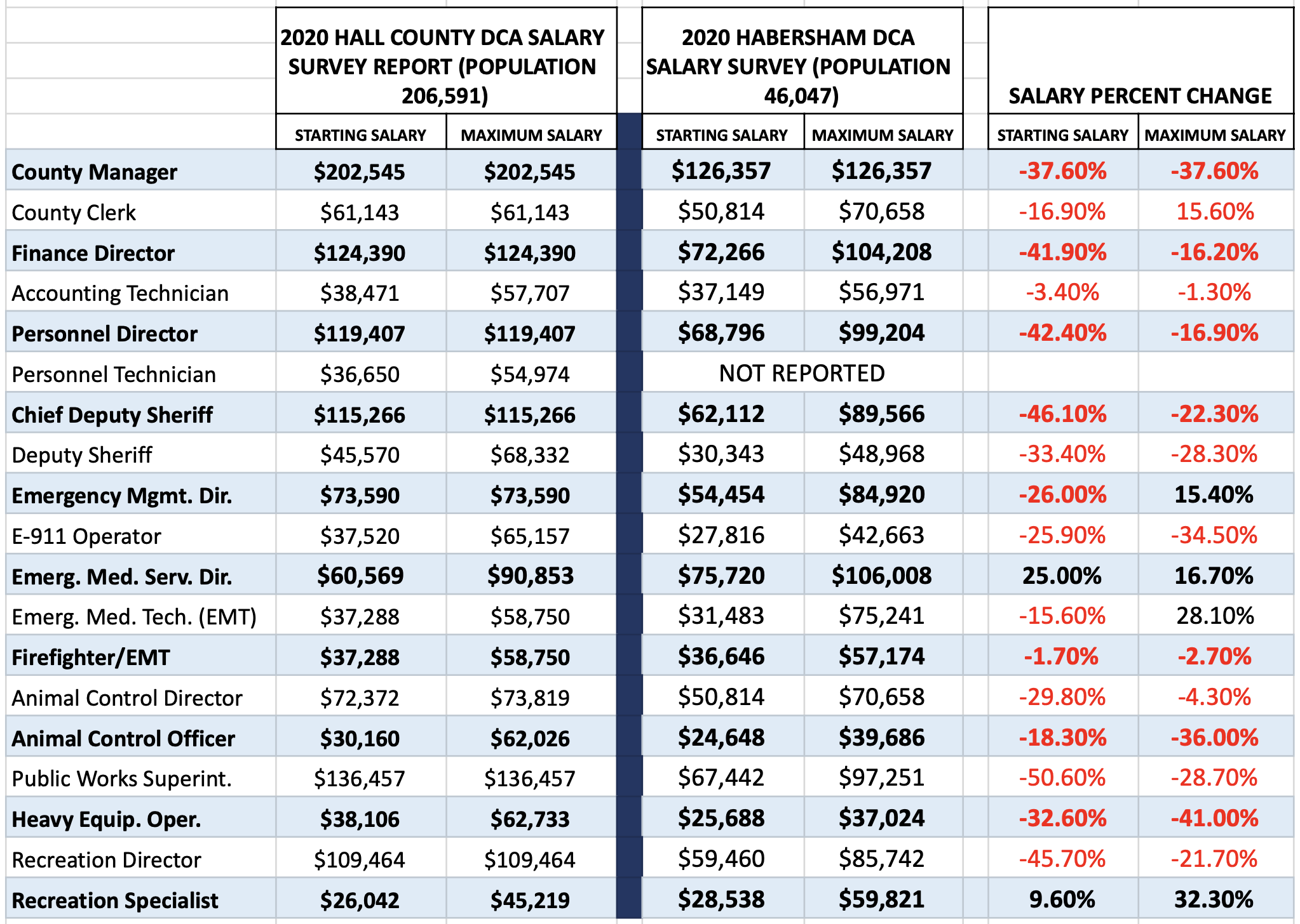 In this comparison from 2020, Habersham County was, on average, 17.1% lower in salaries compared to Hall County. However, in some positions, Habersham’s salaries were significantly less, while two of them paid more.