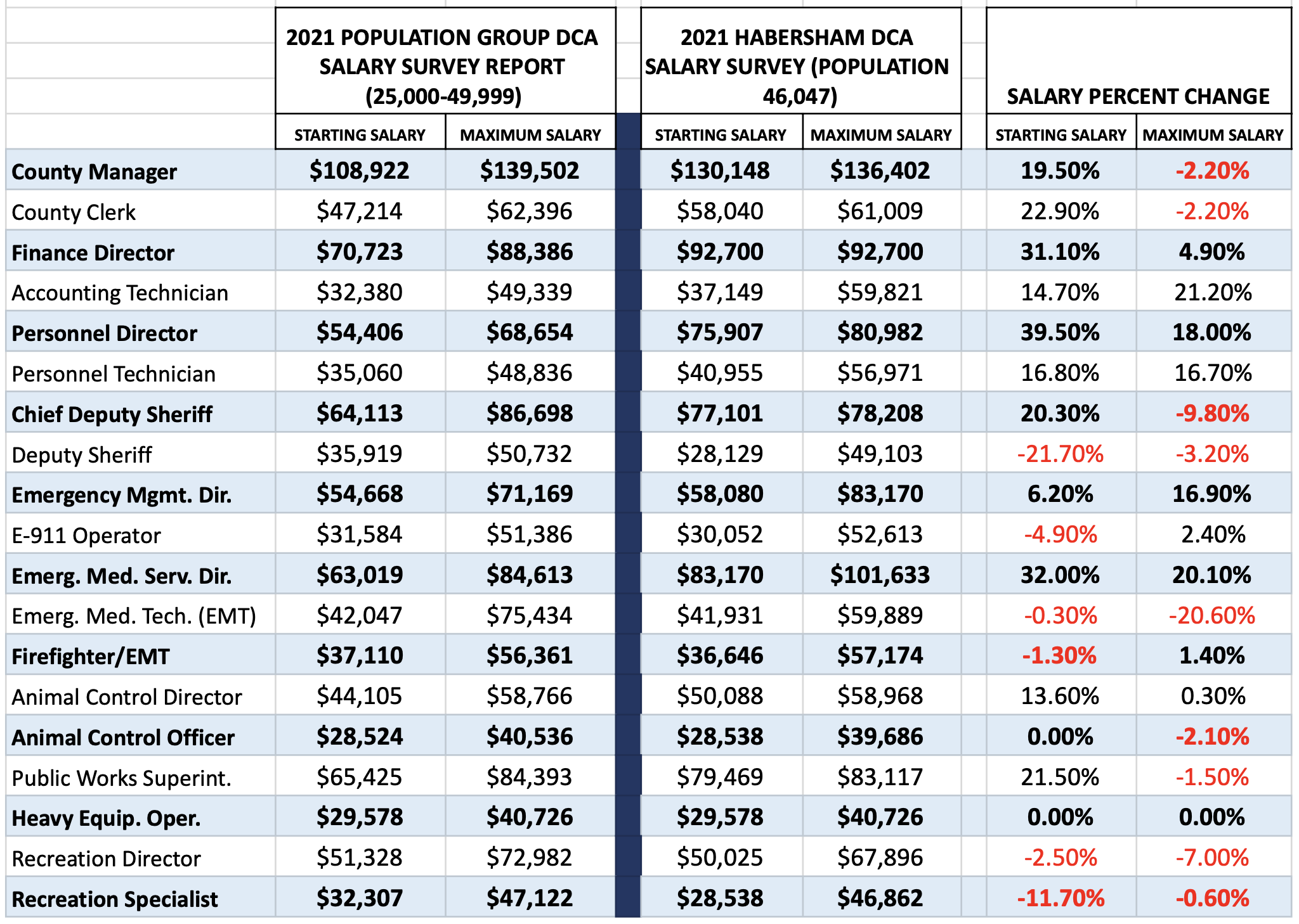 In this table, the Habersham County Manager’s salary is 19.5% higher than the average starting salary of a County Manager within the population group. The maximum salary is 2.2% lower than the average salary for a County Manager within the same group. However, an EMT for Habersham County has a starting salary 0.3% less than their counterparts in other counties of a similar size. The same EMT has a maximum salary of 20.6% less than EMTs in similar size counties.