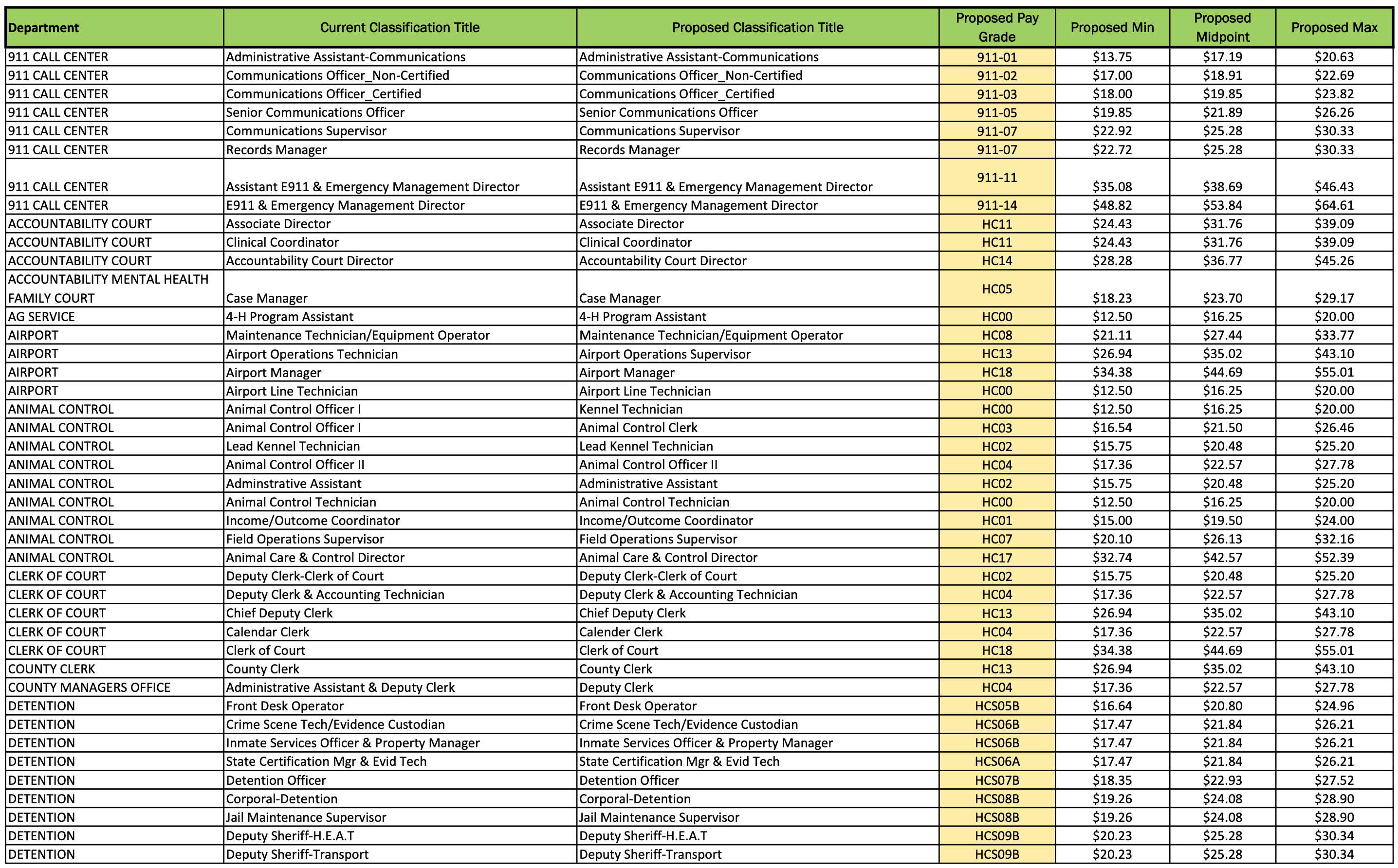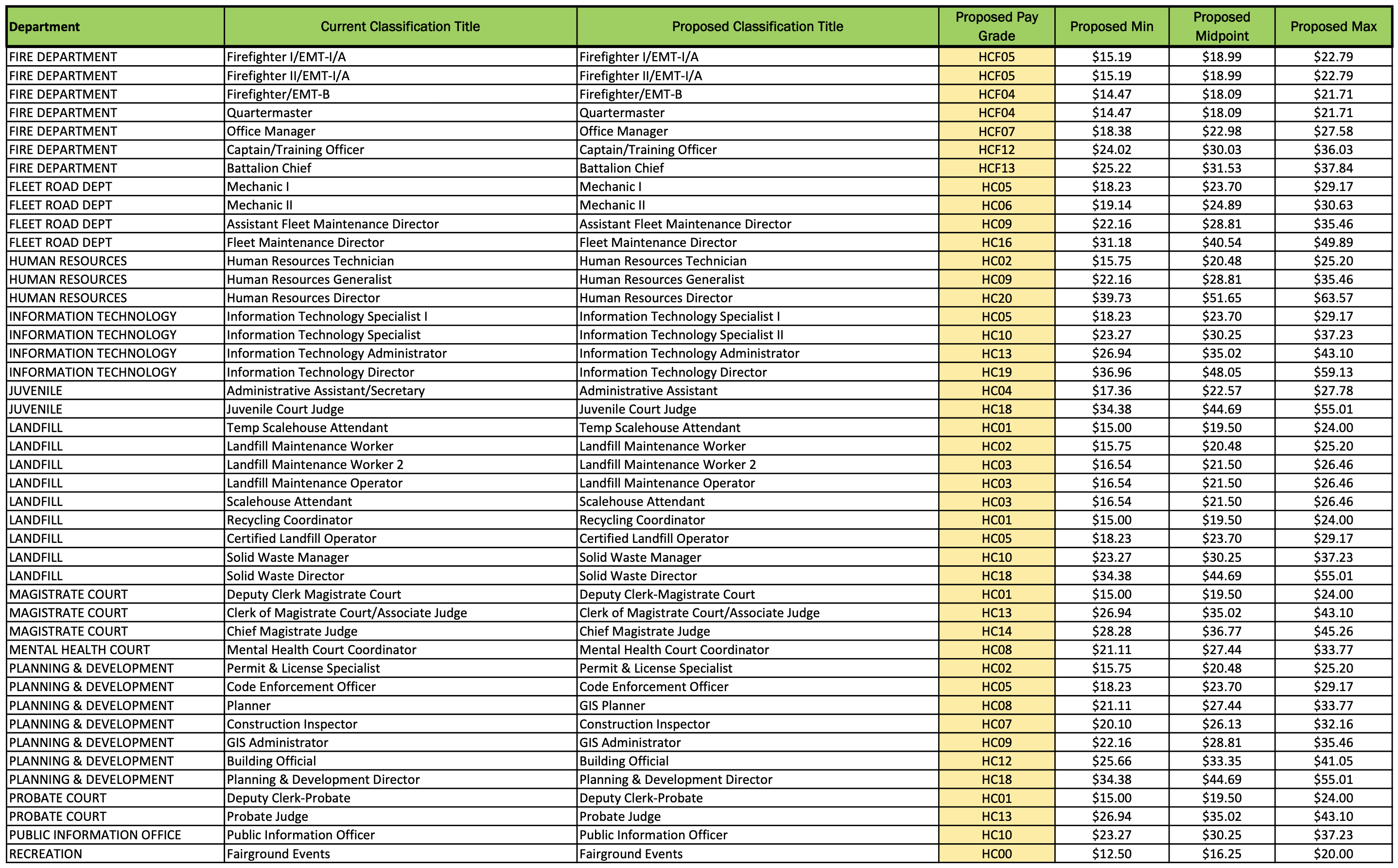Below are the proposed pay tables and reclassifications that were given to commissioners to consider last week. These are the positions and pay ranges they voted on. It’s important to note there is at least one error contained in these tables. Now Habersham brought the matter to the county’s attention, and county clerk Brandy Clark confirmed with HR director Cain that the ‘Finance Director’ position should be listed as ‘Chief Financial Officer.’