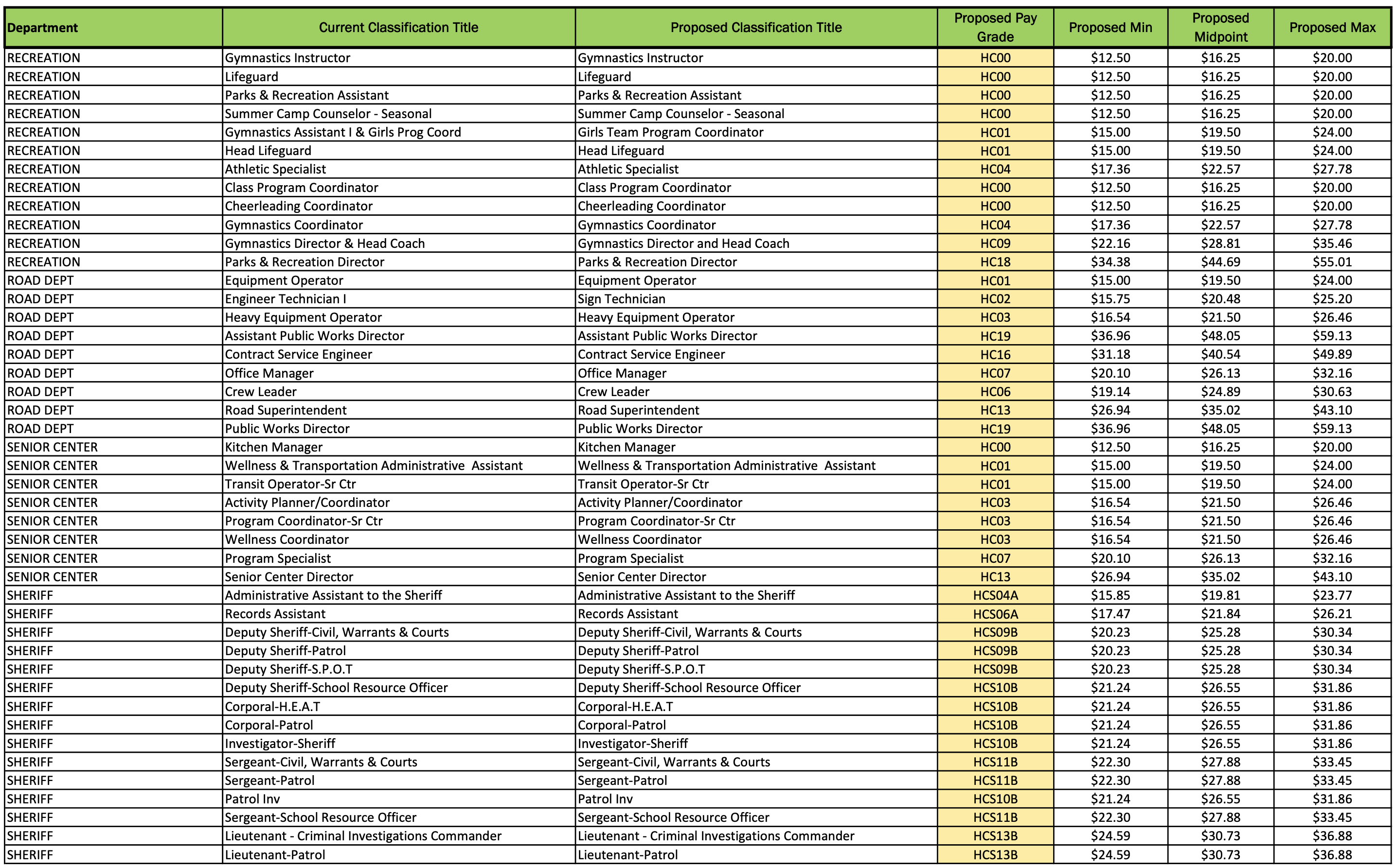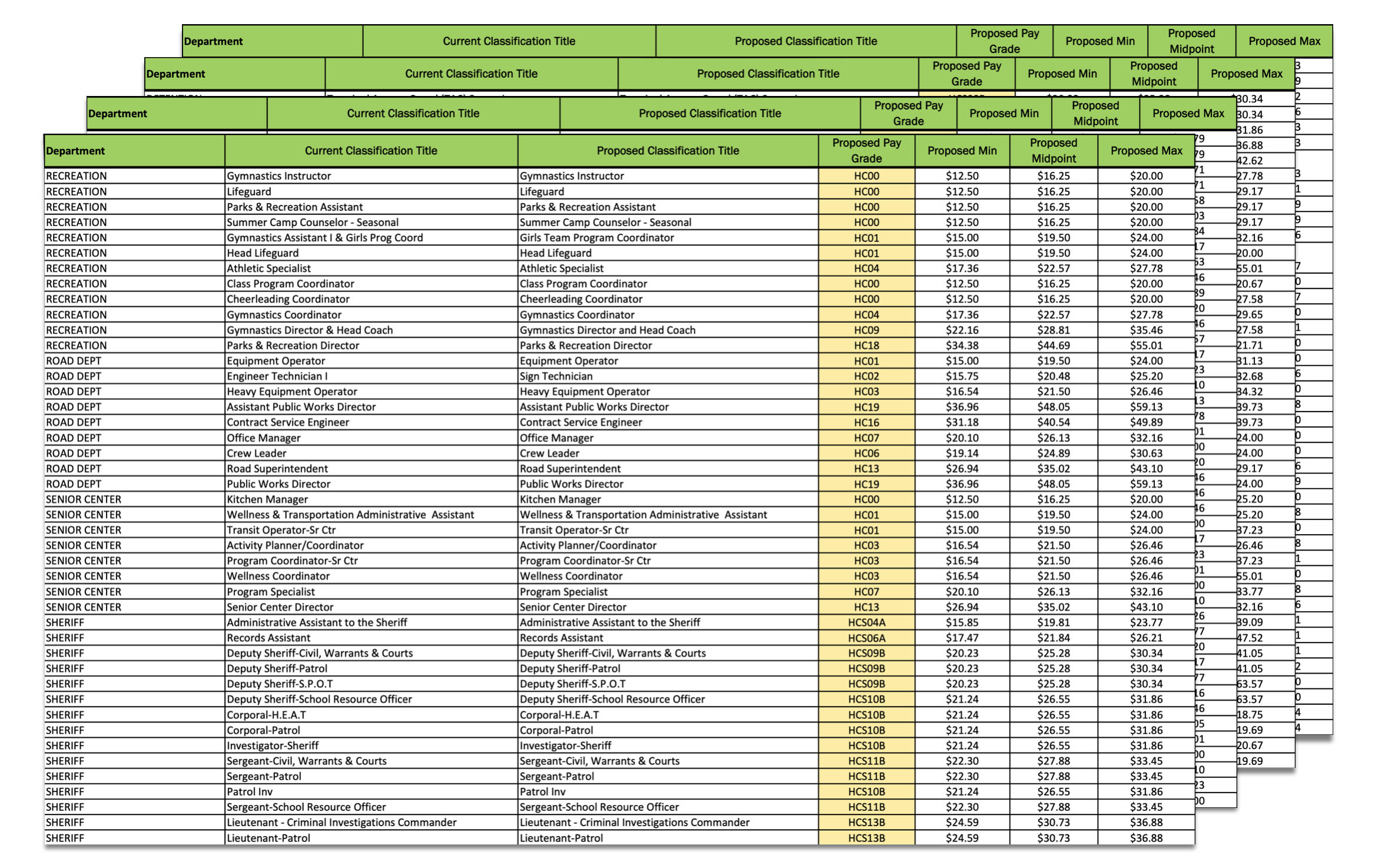 While these tables lay out a road map for future starting salaries and incremental increases, they do not point out exactly who is going to get what now. Ensuring an equitable distribution of raises from the bottom up was one of the things commissioner Bruce Harkness said he hoped to achieve had the chairman given them more time to study the plan.