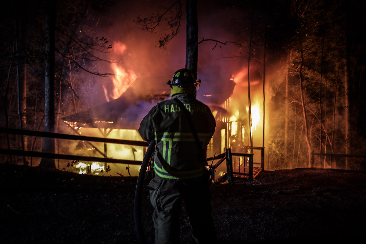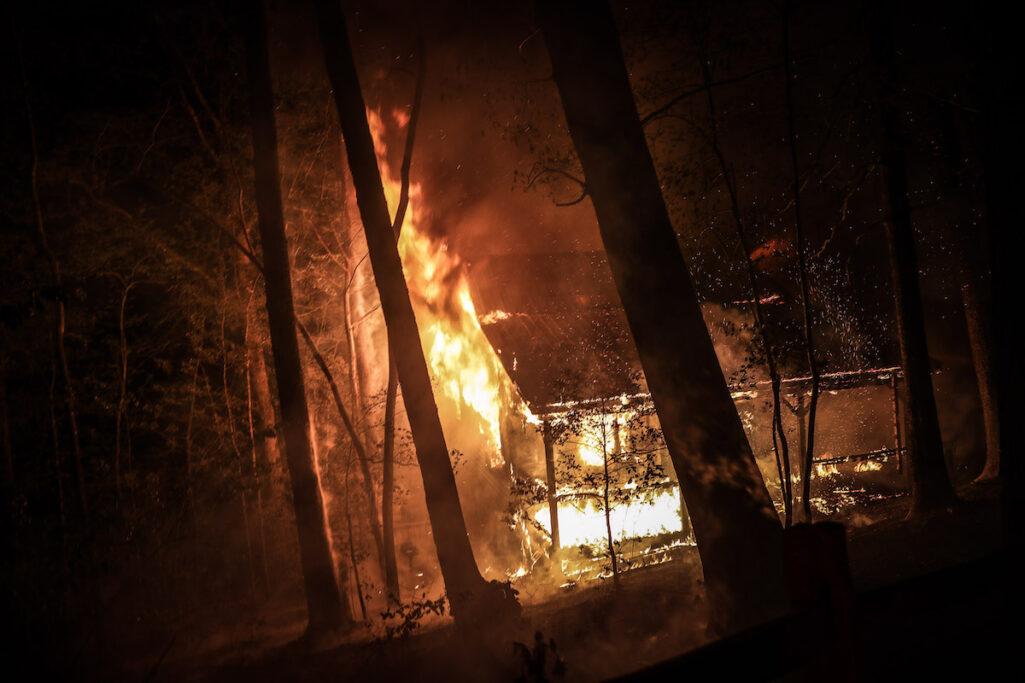 At 12:41 a.m. Tuesday (April 28) firefighters were called to the scene of a structure fire at 251 Sunburst Lane in Batesville. When they arrived, they found a cabin fully involved in flames with a small woods fire burning nearby.
