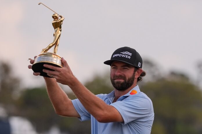 Cameron Young holds the The Players Championship Trophy after the final round of The Players Championship golf tournament, Sunday, March 15, 2026, in Ponte Vedra Beach, Fla. (AP Photo/Gerald Herbert)
